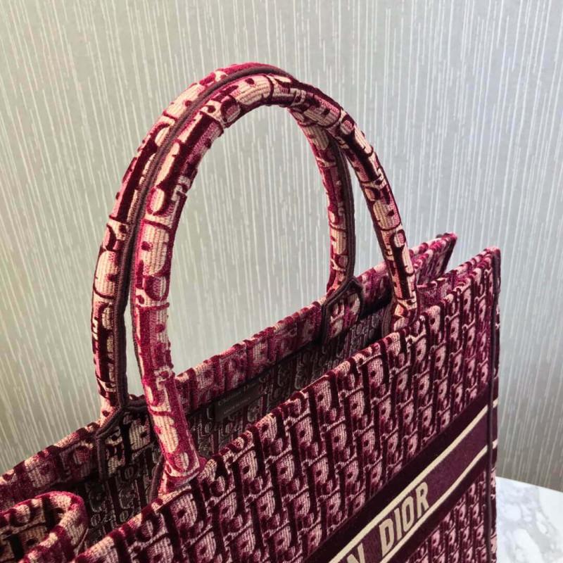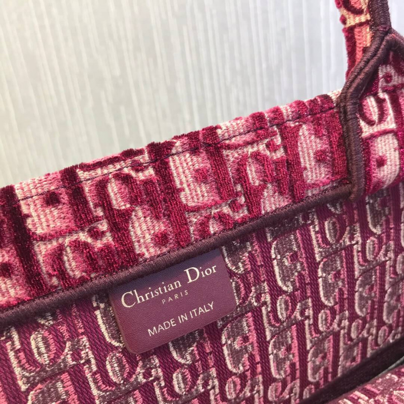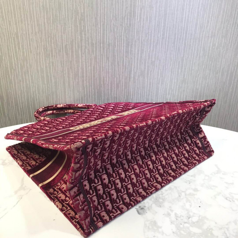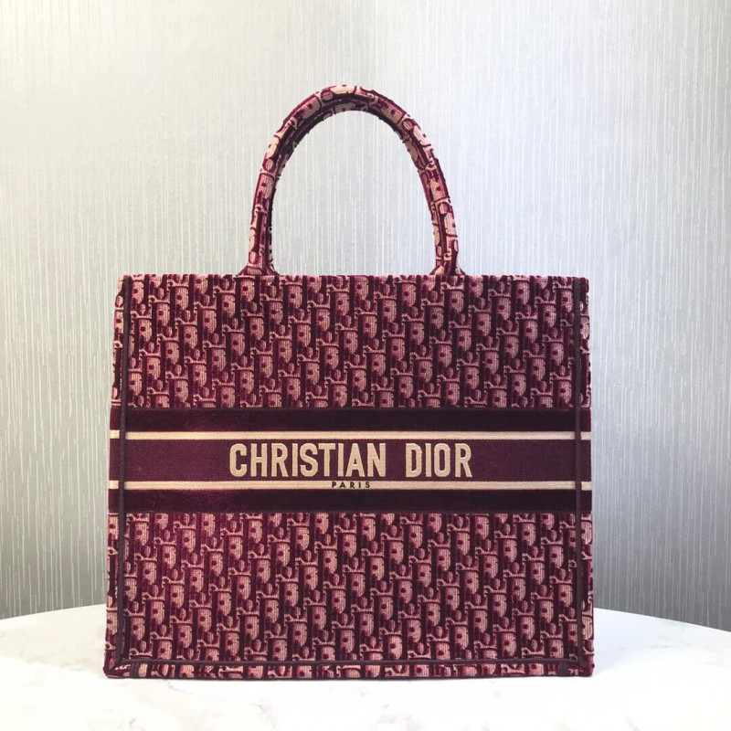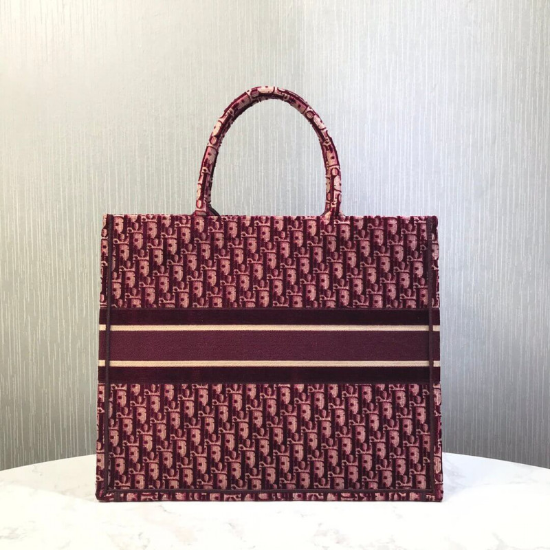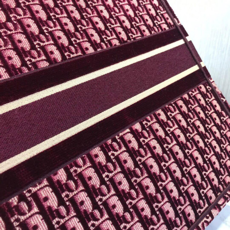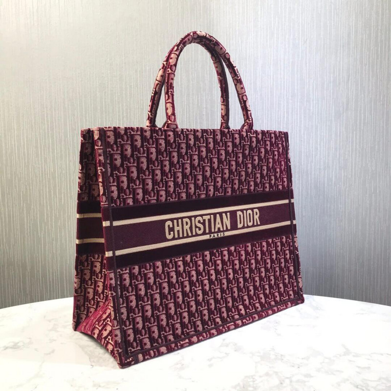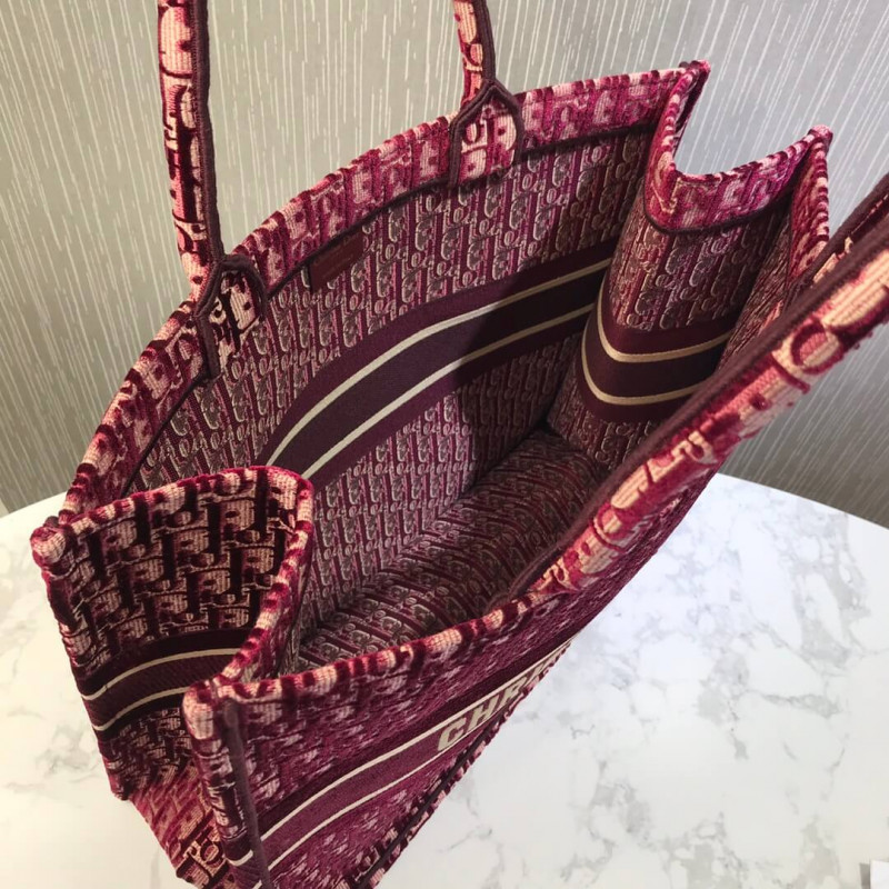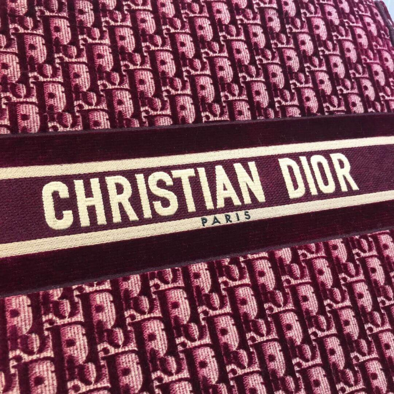 The Dior Book Tote, an original style introduced by Dior s Creative Director, Maria Grazia Chiuri, has become a staple of the Dior aesthetic. Ideally designed to carry all your daily essentials, the large style is fully embroidered with the iconic Dior Oblique pattern in burgundy, with a Christian Dior signature on the front. This carryall is a perfect example of the Dior savoir-faire and it may be worn with other small accessories or the Mitzah scarf for a complete look.