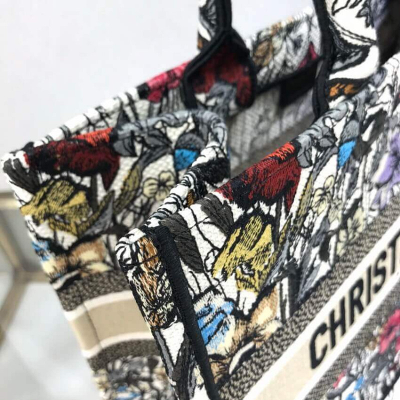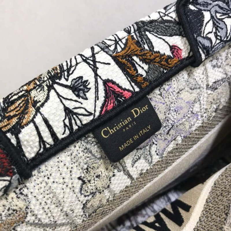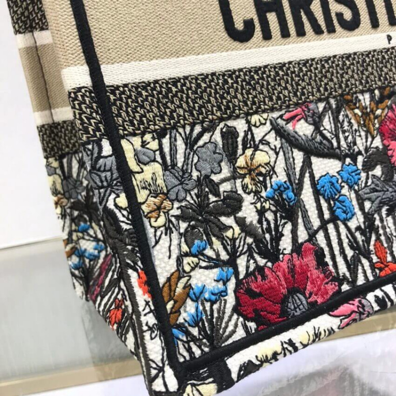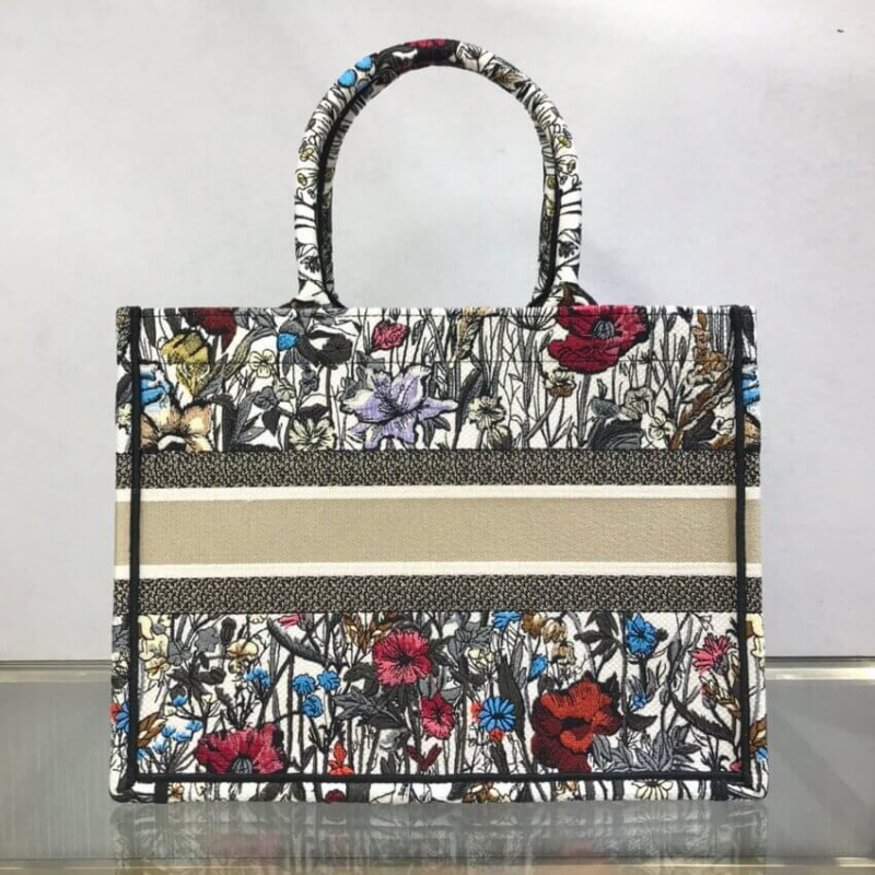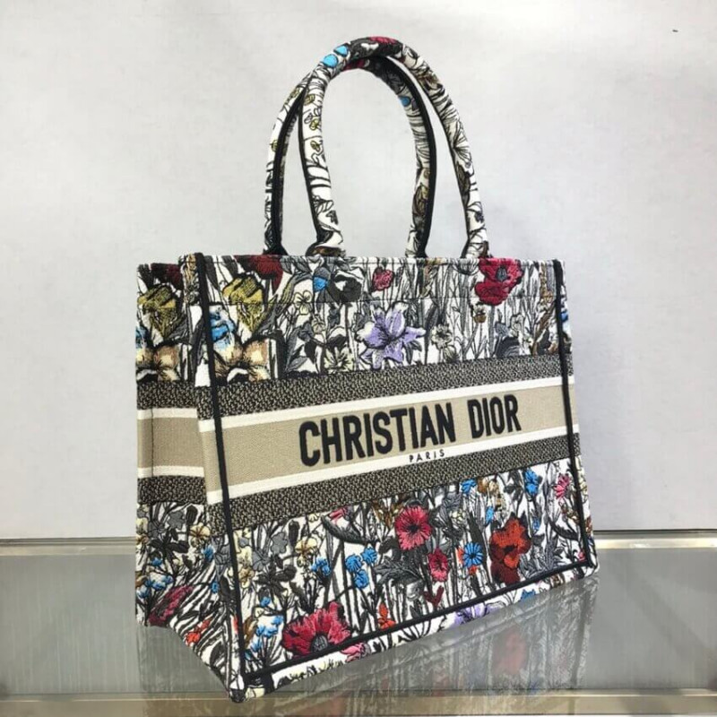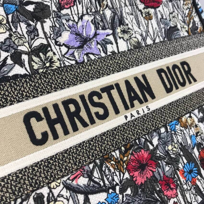 The Dior Book Tote, an original style introduced by Creative Director Maria Grazia Chiuri, has become a staple of the Dior aesthetic. This small style, fully embroidered with the Mille Fleurs motif, is reminiscent of bucolic Apulian landscapes, a central theme of the collection. Adorned with the Christian Dior signature, the Dior Book Tote exemplifies the House s signature savoir-faire and can be paired with other Mille Fleurs creations from the collection.