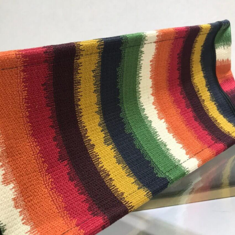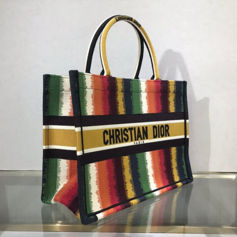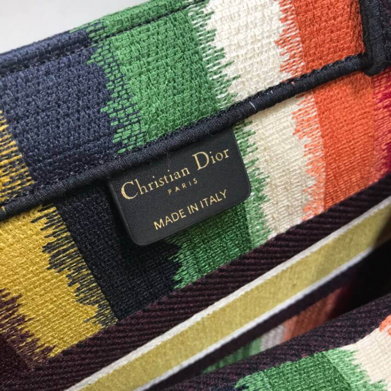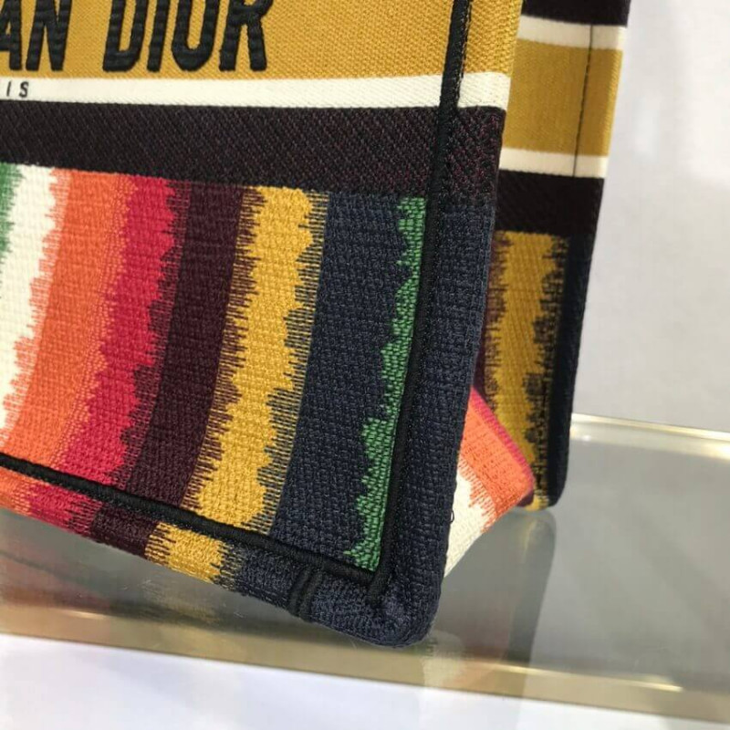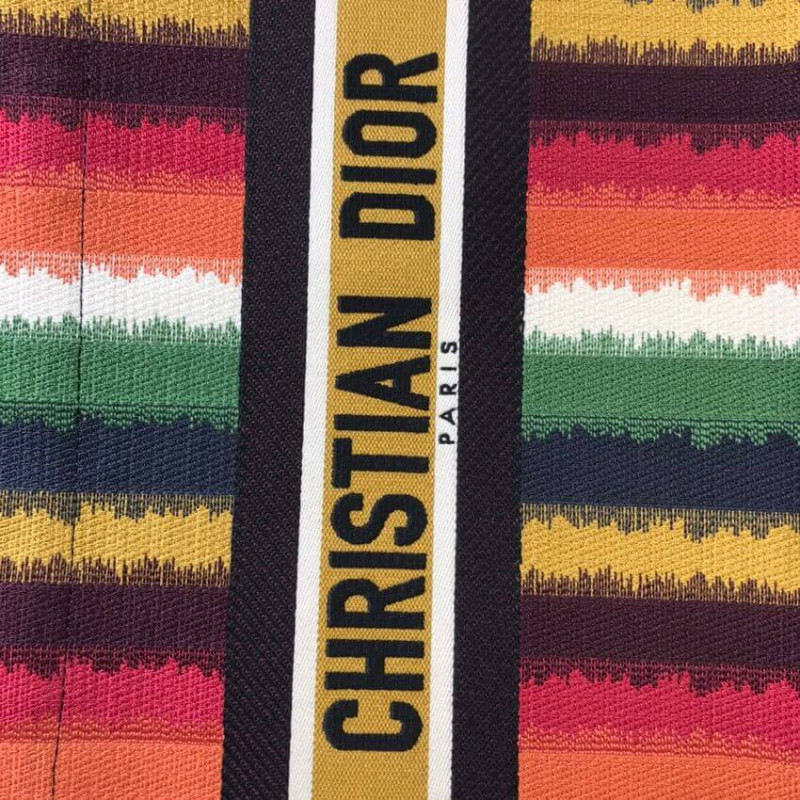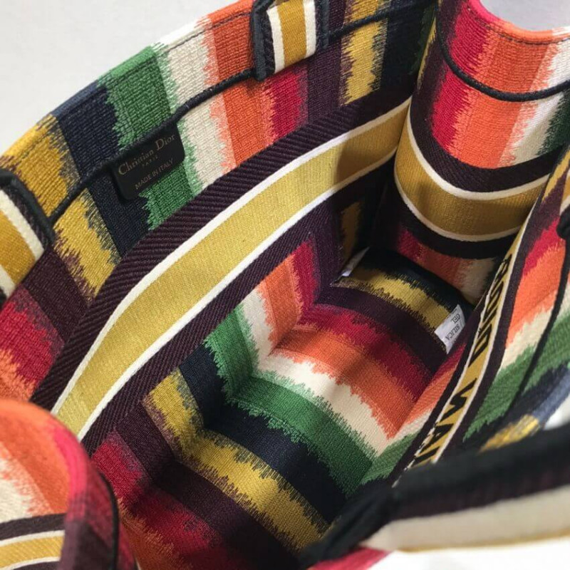 The Dior Book Tote, an original style introduced by Creative Director Maria Grazia Chiuri, has become a staple of the Dior aesthetic. Designed to carry all the daily essentials, the silhouette offers a new take on the bayadère motif with a modern variation, fully embroidered with the multicolor and heathered-effect D-Stripes motif. The carryall boasts a Christian Dior signature on the front and is a prime example of Dior savoir-faire.