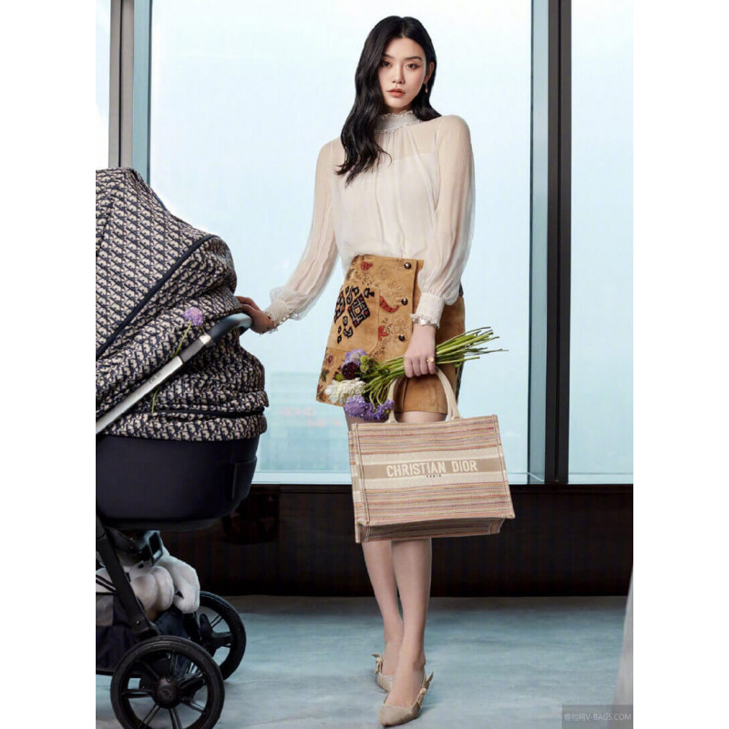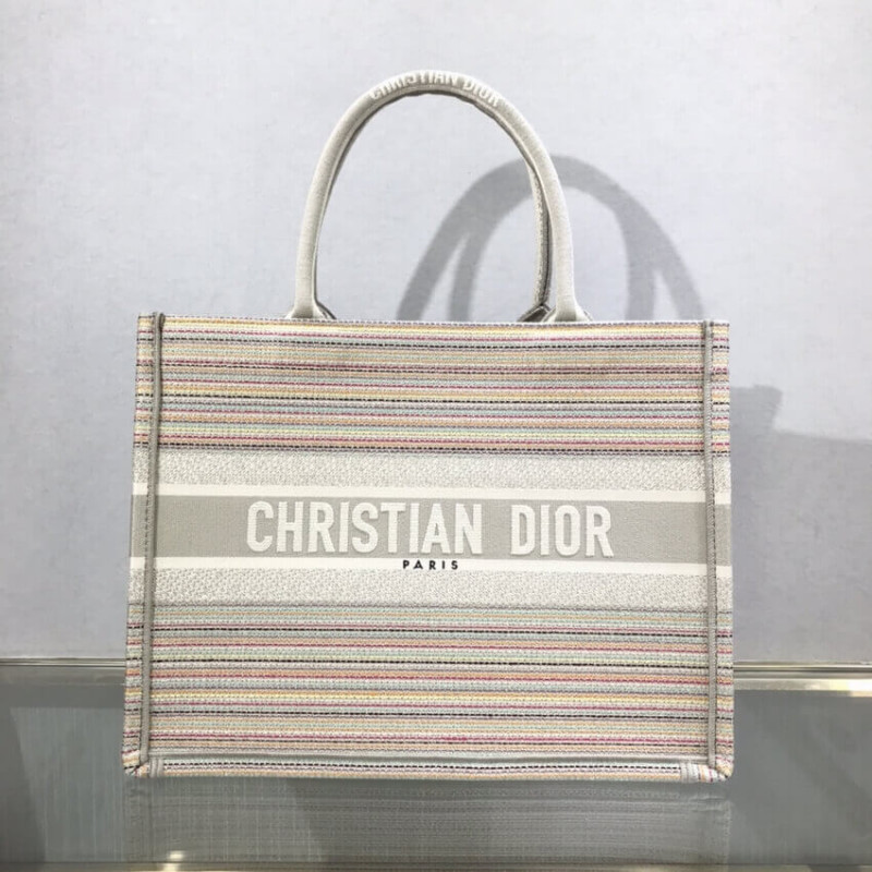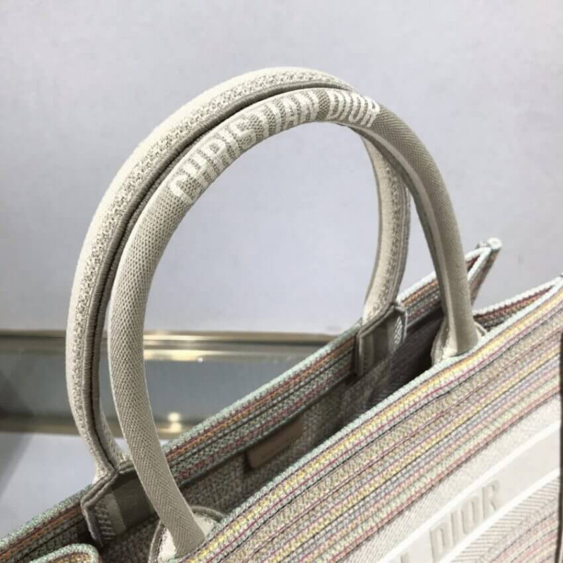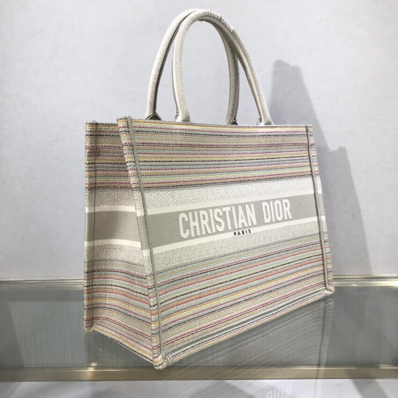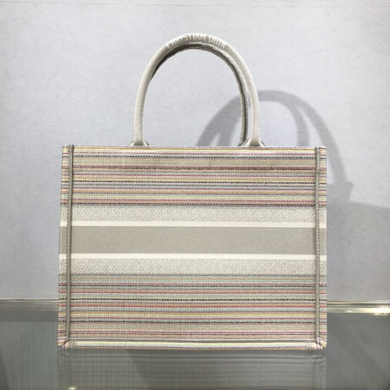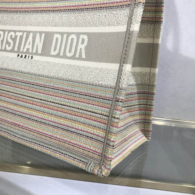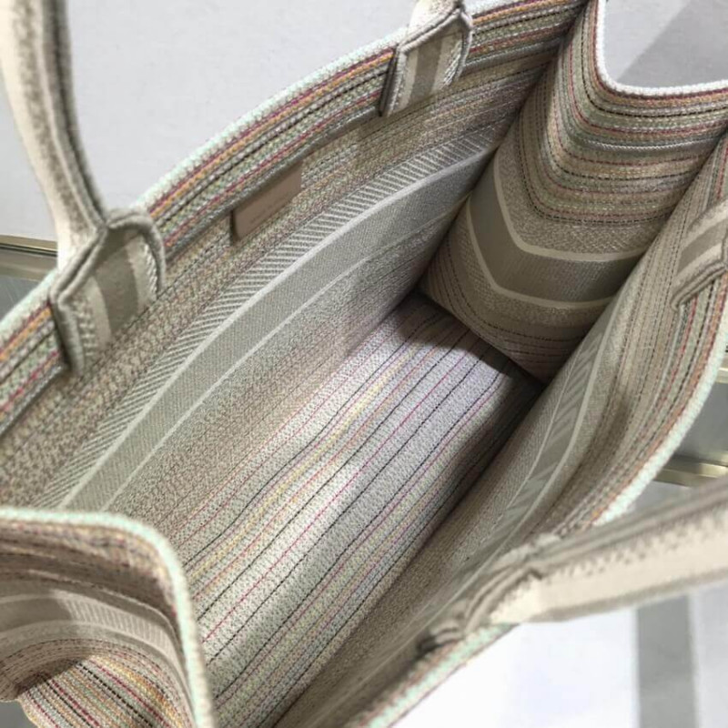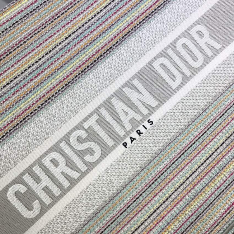 The Dior Book Tote, an original style introduced by Creative Director Maria Grazia Chiuri, has become a staple of the Dior aesthetic. This small style is part of the Dior Gold capsule collection and can hold all the daily essentials. It is fully embroidered with thin multicolor pastel stripes and enhanced with metallic thread. Adorned with the Christian Dior signature on the front, the Dior Book Tote exemplifies the House s signature savoir-faire and can be paired with other Dior Gold creations from the collection.