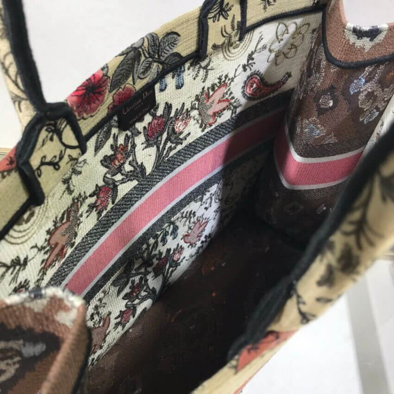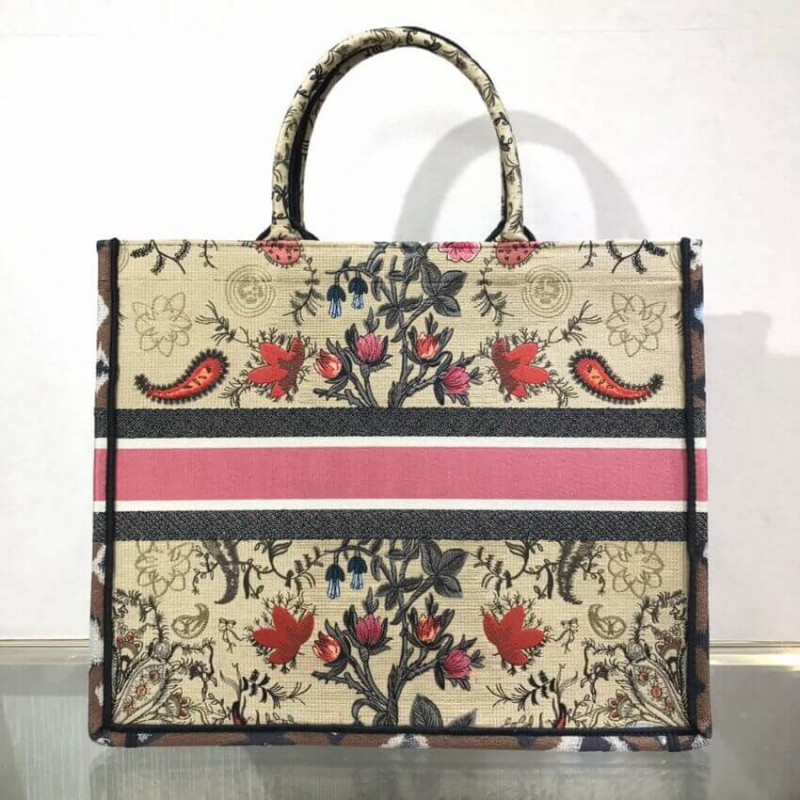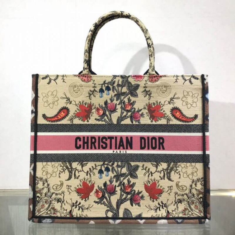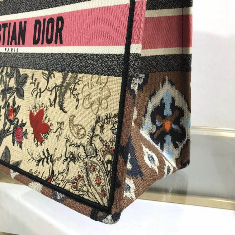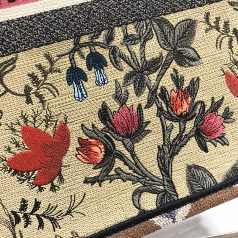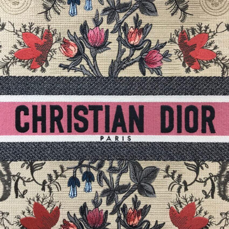 The Dior Book Tote, an original style introduced by Creative Director Maria Grazia Chiuri, has become a staple of the Dior aesthetic. Designed to carry all the daily essentials, the silhouette is fully embroidered with the multicolor Dior Flowers motif. The carryall boasts a Christian Dior signature on the front while the sides are adorned with a graphic motif for a contrasting modern touch. The bag is a prime example of Dior savoir-faire.