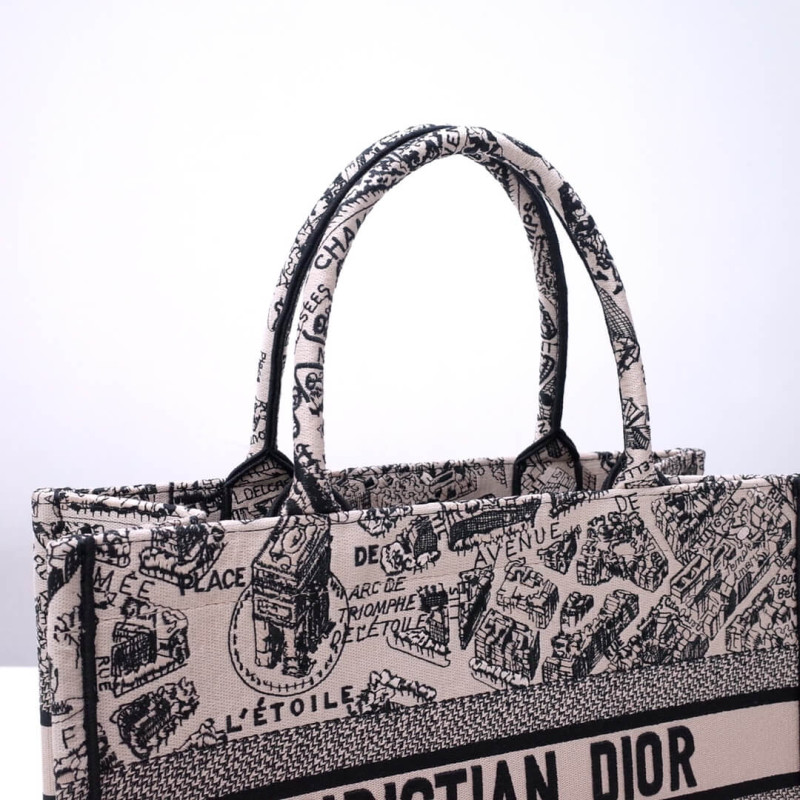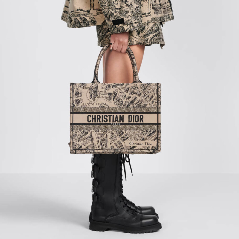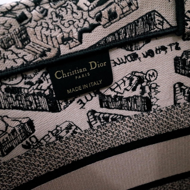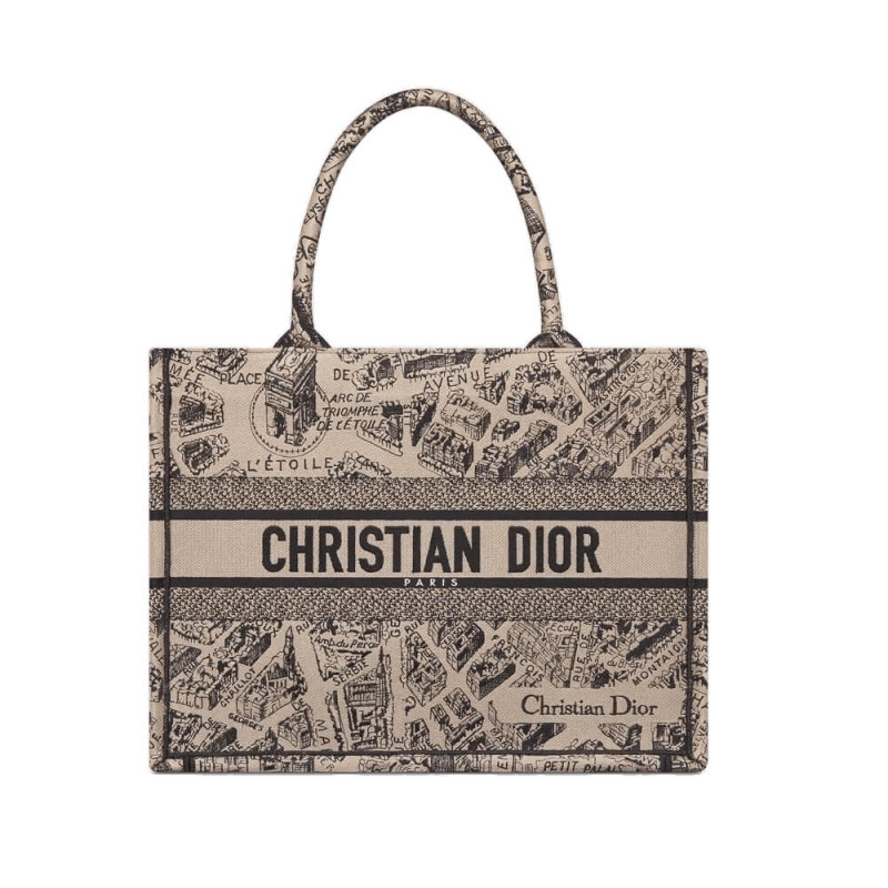 Introduced by Maria Grazia Chiuri, Creative Director of Christian Dior, the Dior Book Tote has become a staple of the Dior aesthetic. Designed to hold all the daily essentials, the style is fully embroidered with the beige and black Plan de Paris motif, inspired by House archives and centered around Dior s historic address on Avenue Montaigne. Adorned with the Christian Dior Paris signature on the front, the large tote exemplifies the House s signature savoir-faire and may be carried by hand or worn over the shoulder.