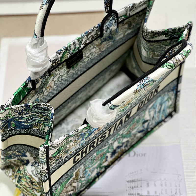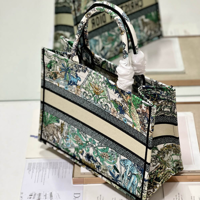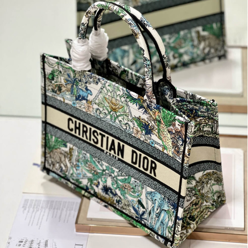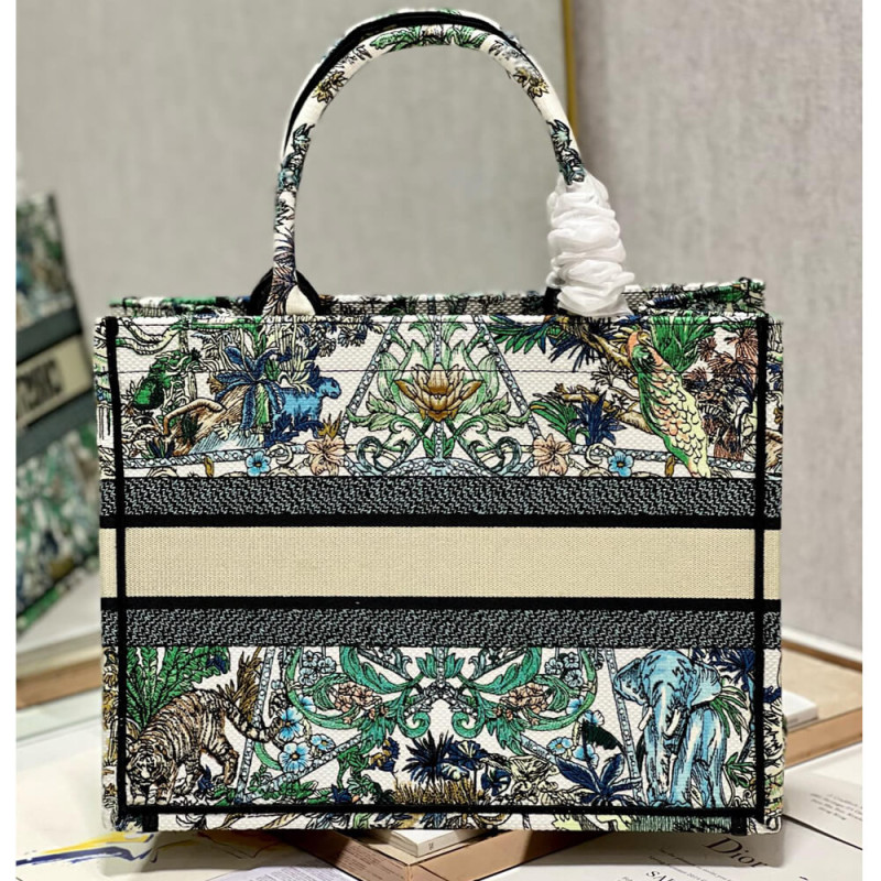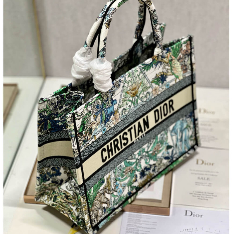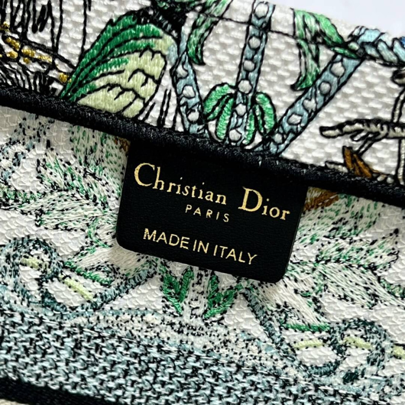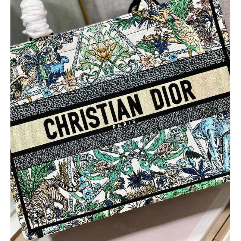 The Dior Book Tote is an original creation introduced by Dior s Creative Director, Maria Grazia Chiuri, and has become a staple of the Dior aesthetic. Designed to hold all the daily essentials, the style is fully embroidered with the white multicolor étoile de Voyage motif by Pietro Ruffo, which features a harmonious immersion into the heart of Indian flora and fauna set in a star. Adorned with a Christian Dior Paris signature on the front, the medium tote exemplifies the House s signature savoir-faire and may be carried by hand or worn over the shoulder.