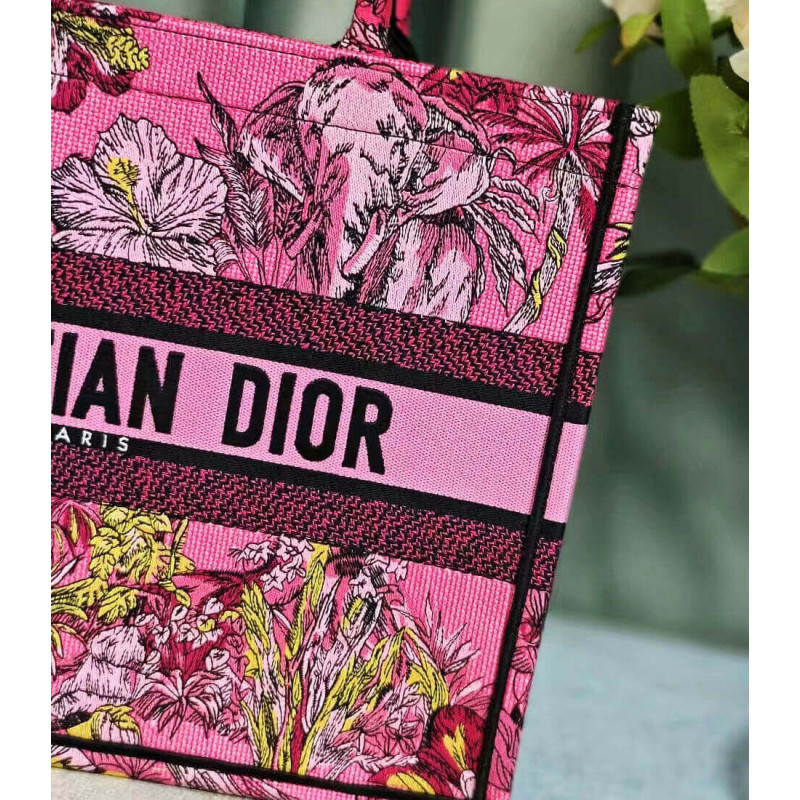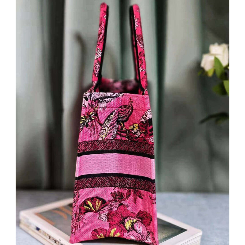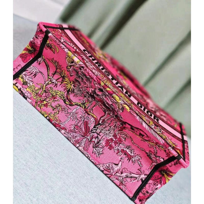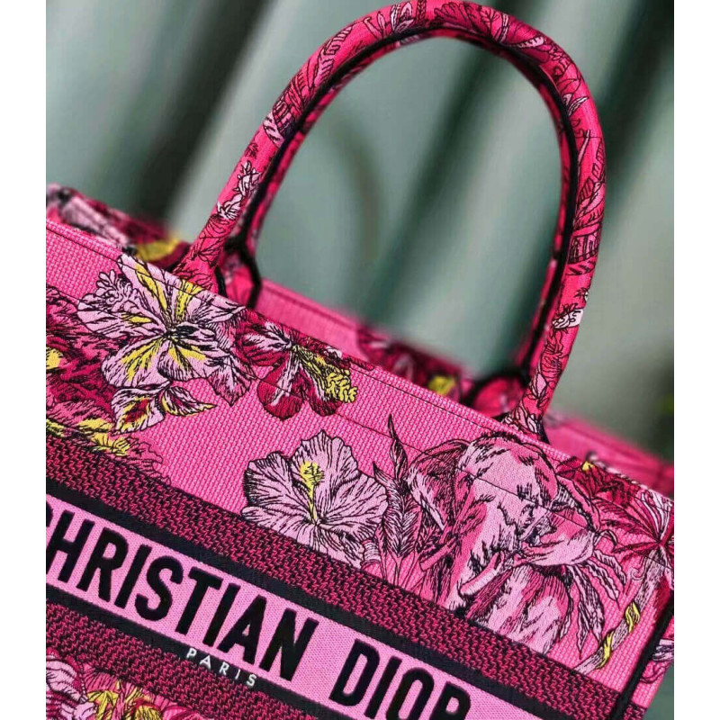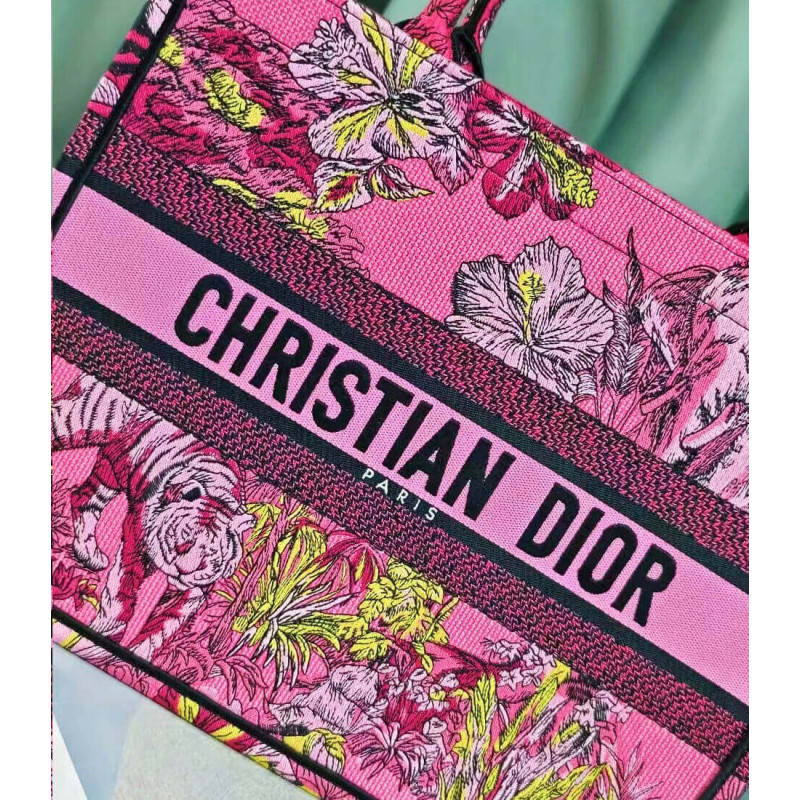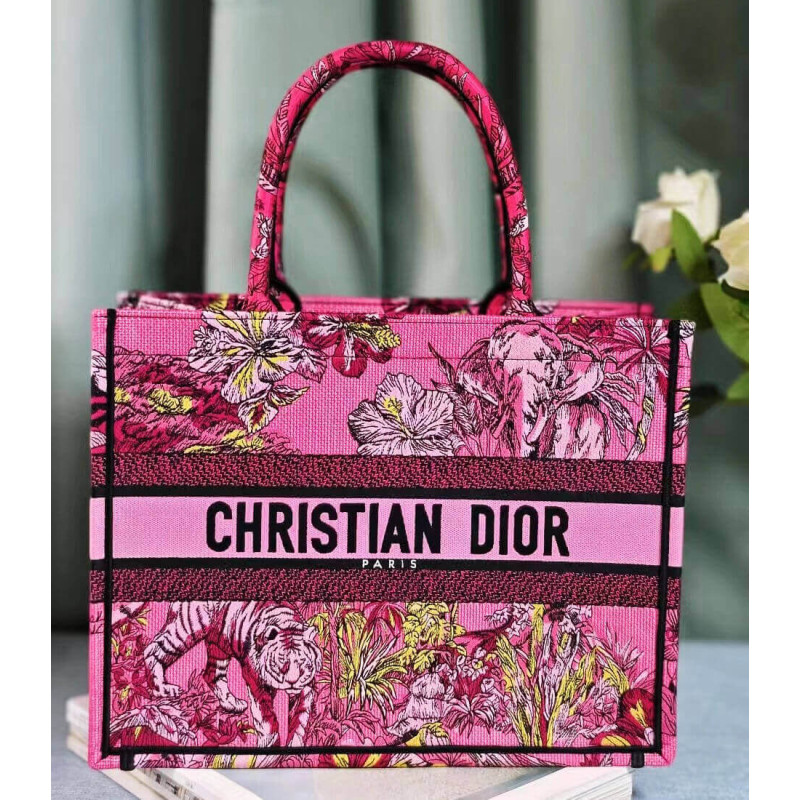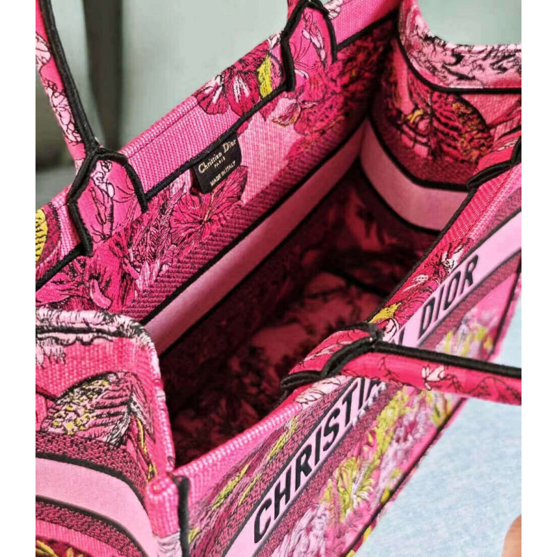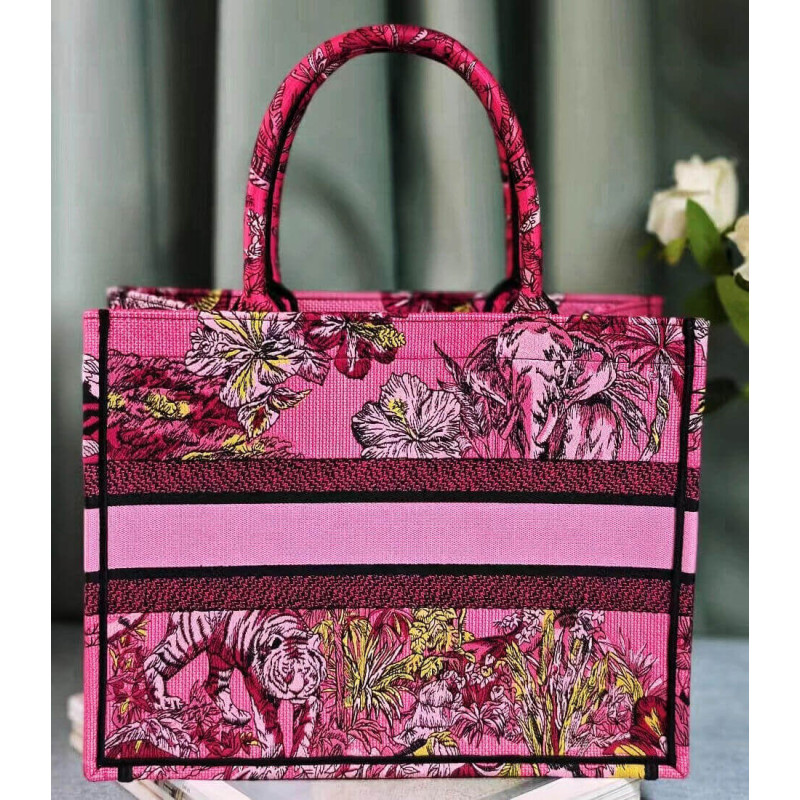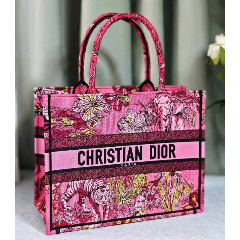 The Dior Book Tote is an original creation introduced by Christian Dior s Creative Director, Maria Grazia Chiuri, and has become a staple of the Dior aesthetic. Designed to hold all the daily essentials, it is fully embroidered with the fuchsia multicolor Toile de Jouy Voyage motif by Pietro Ruffo, setting Mr. Dior s iconic pattern into the heart of Indian flora and fauna. Adorned with a Christian Dior Paris signature on the front, the medium tote exemplifies the House s signature savoir-faire and may be carried by hand or worn over the shoulder.