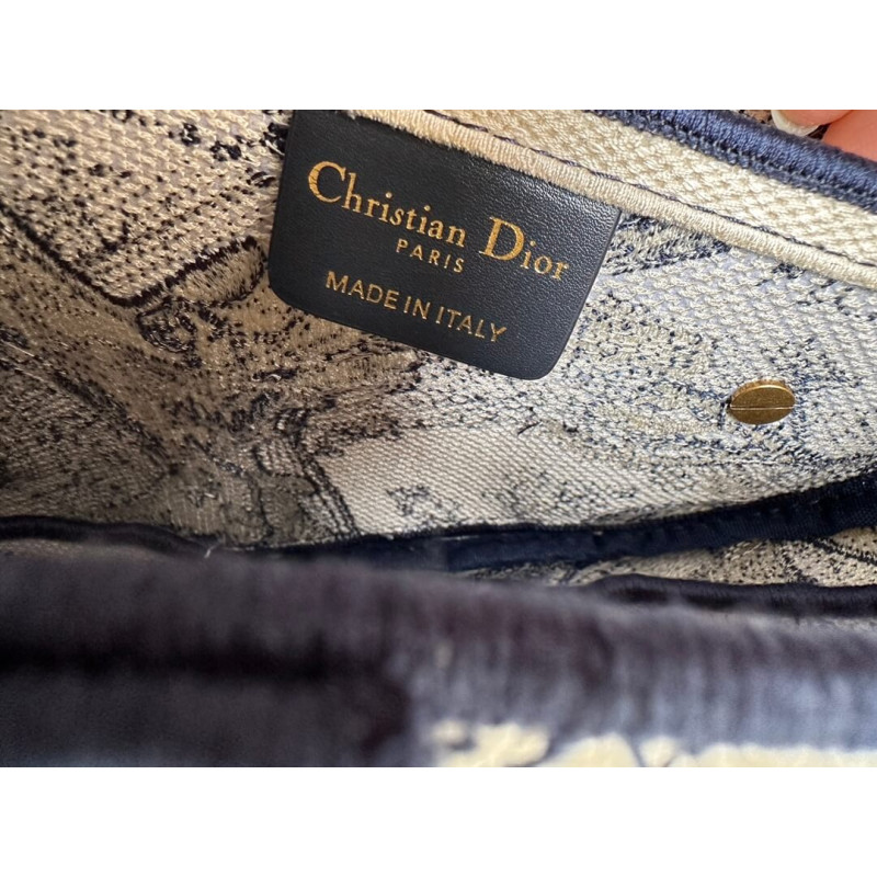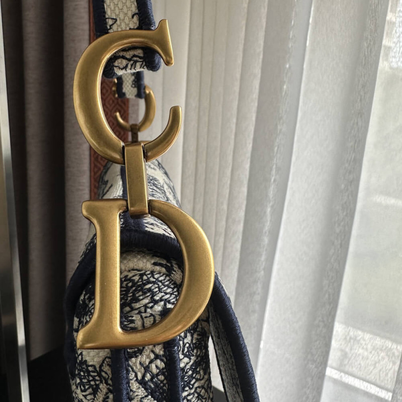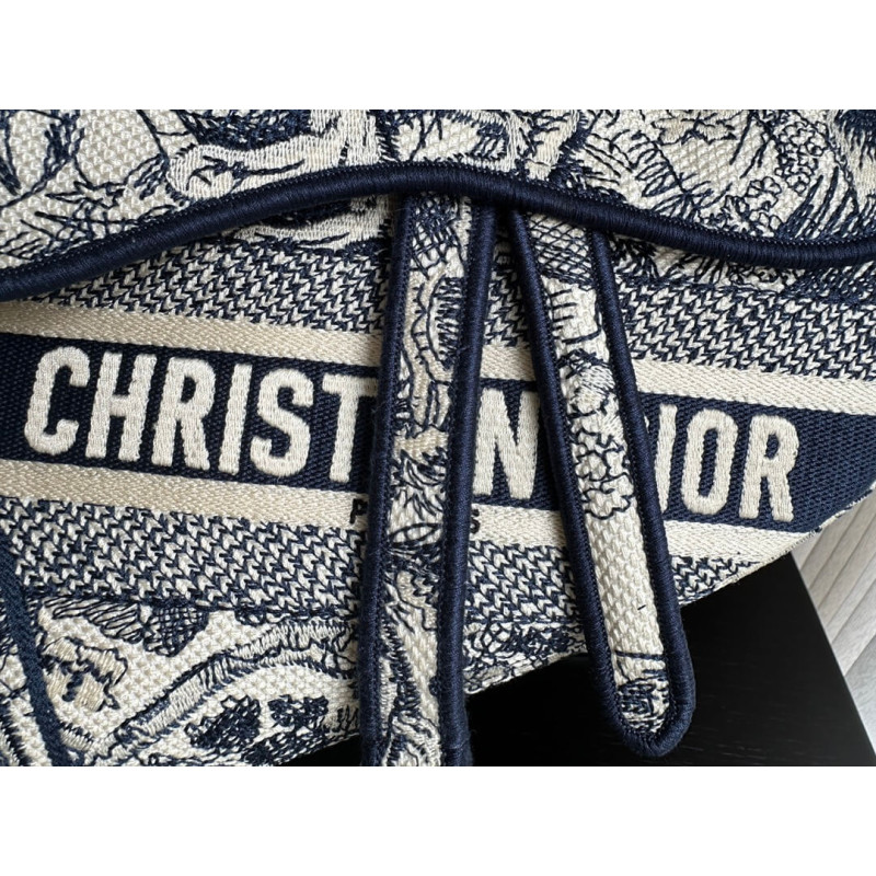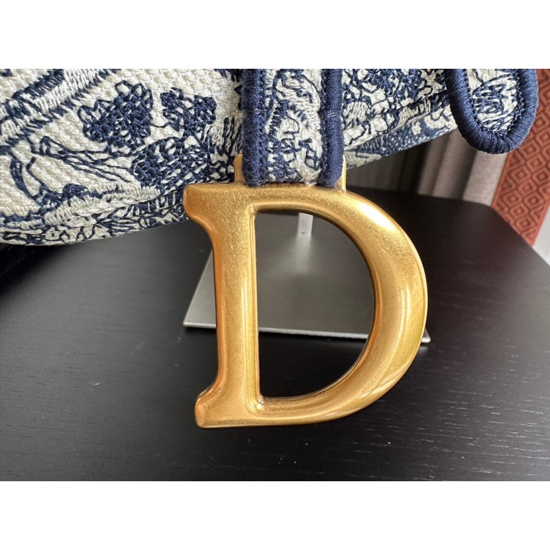 Maria Grazia Chiuri brings a fresh update to the iconic Saddle bag. The design is fully embroidered with the hallmark blue Toile de Jouy motif, further enhanced by a CHRISTIAN DIOR signature on the front. The legendary design features a Saddle flap with a magnetic D stirrup clasp and boasts an antique gold-finish metal CD signature on each side of the handle. The bag can be customized with different shoulder straps and may be coordinated with the season s other Toile de Jouy creations.