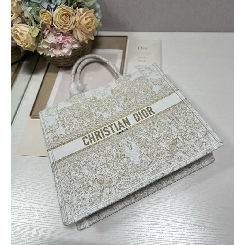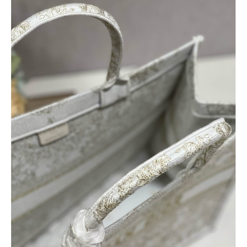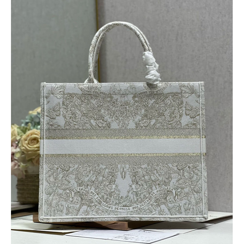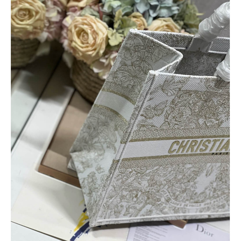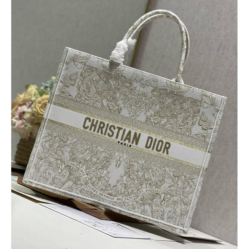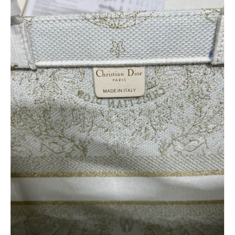 Introduced by Maria Grazia Chiuri, Creative Director of Christian Dior, the Dior Book Tote has become a staple of the Dior aesthetic. Designed to hold all the daily essentials, it is fully embroidered with a gold-tone and white Butterfly Around The World motif, showcasing the collection s signature butterfly embellished with the words L envol des papillons dévoile nos désirs aux étoiles. Adorned with the Christian Dior Paris signature on the front, the large tote exemplifies the House s signature savoir-faire and may be carried by hand or worn over the shoulder.