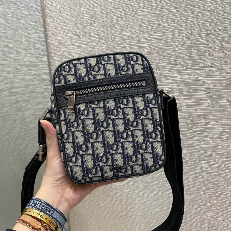 A new style this season, the messenger pouch is a compact and practical piece, an ideal daily companion. Crafted in beige and black Dior Oblique jacquard, it is embellished with black grained calfskin details. The zipped compartment and the front pocket can store all the essentials while the adjustable Christian Dior strap allows it be worn over the shoulder or crossbody.