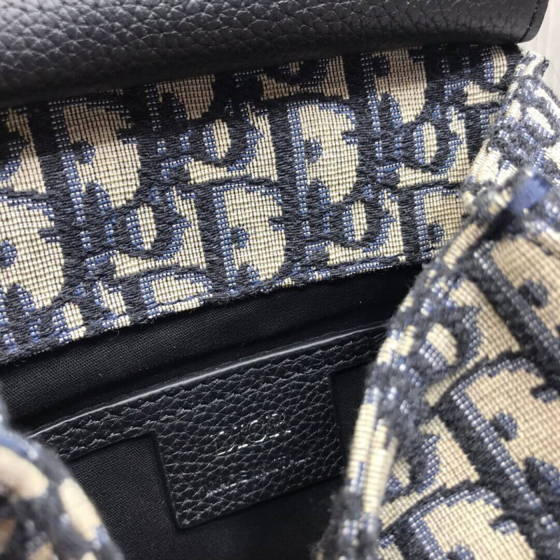 The Dior Oblique Jacquard Mini Saddle Backpack has signature black grained calfskin details. A ‘Christian Dior’ buckle closes the front flap and connects to the exterior saddle-style grained leather pocket. The top handle is centered between the two adjustable, padded nylon back straps. There is an interior patch pocket to keep essentials organized. Meant to be worn on the back or carried by hand, this is a classic Dior style updated with modern detailing.