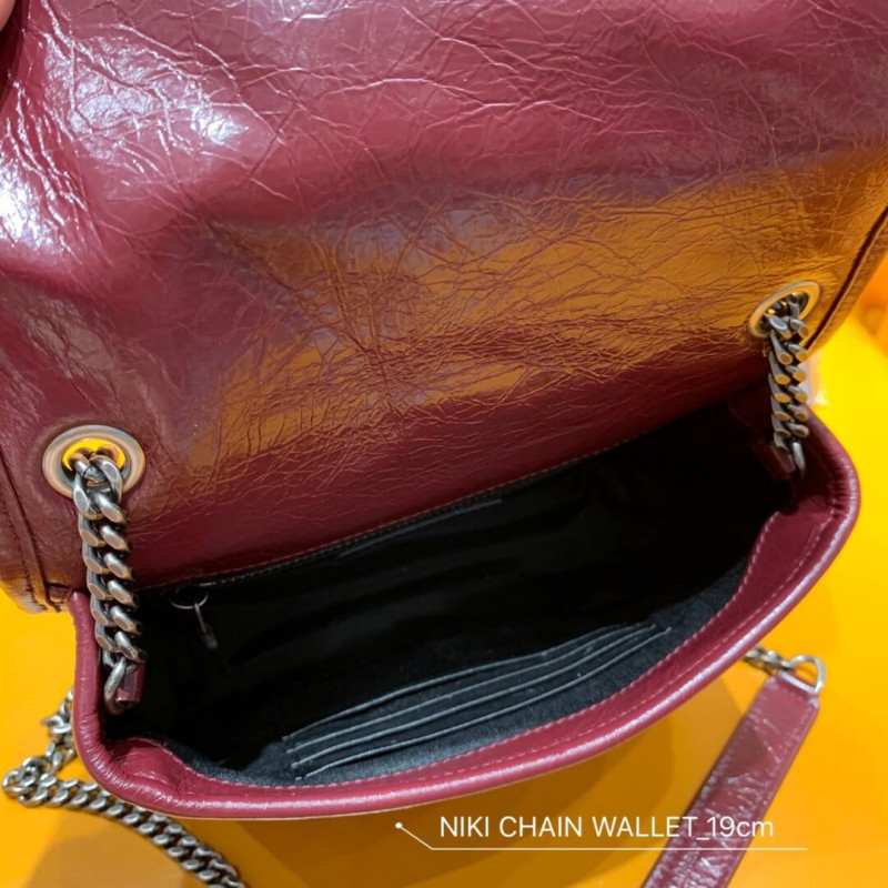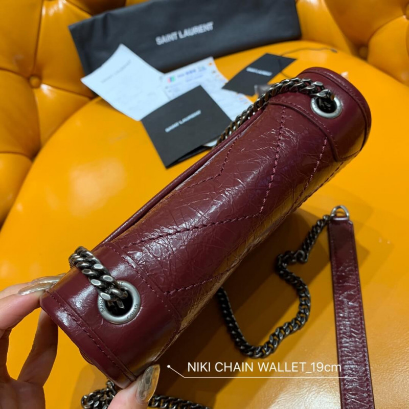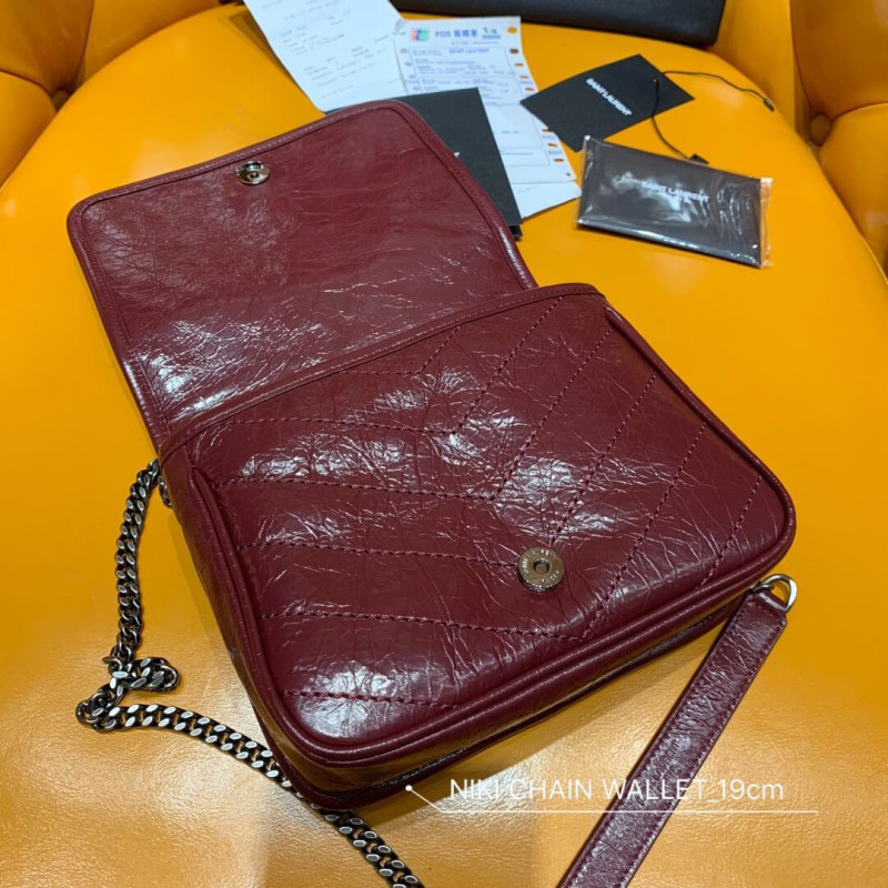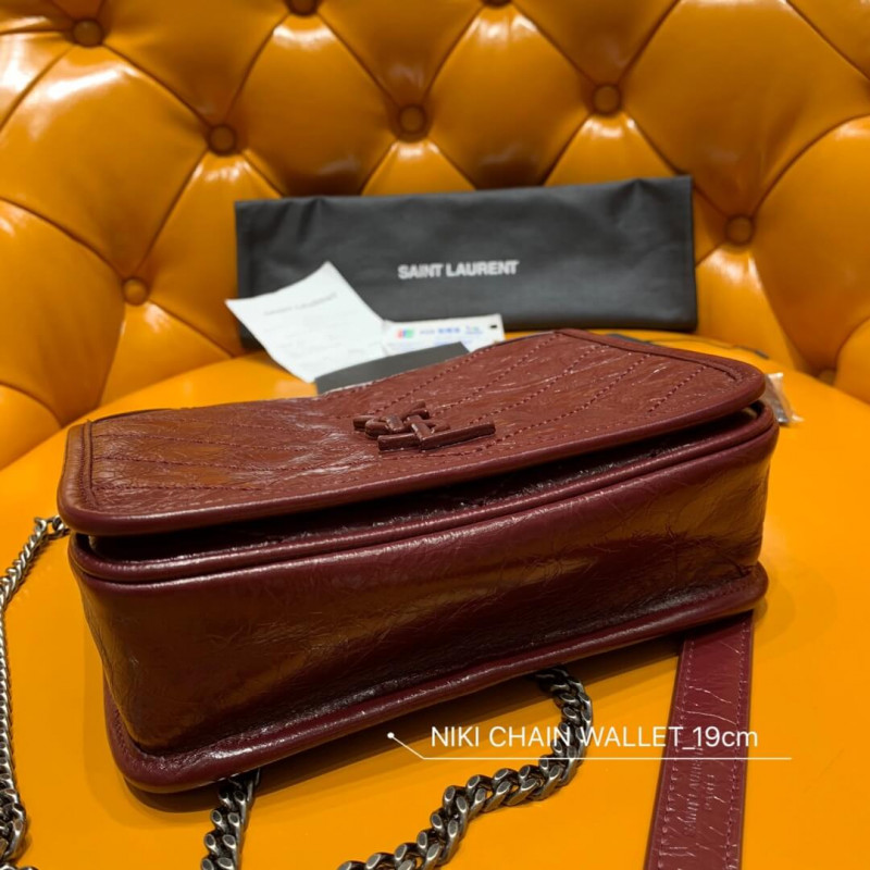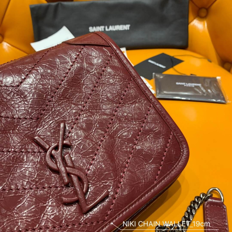 Chain wallet with quilted overstitching, featuring a flap decorated with covered ysl initials and a removable shoulder strap chain with leather reinforcements.