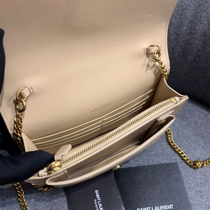 Saint laurent flap monogram chain wallet with magnetic fastener, removable leather and chain strap, interlaced ysl initials in metal and a leather handle.