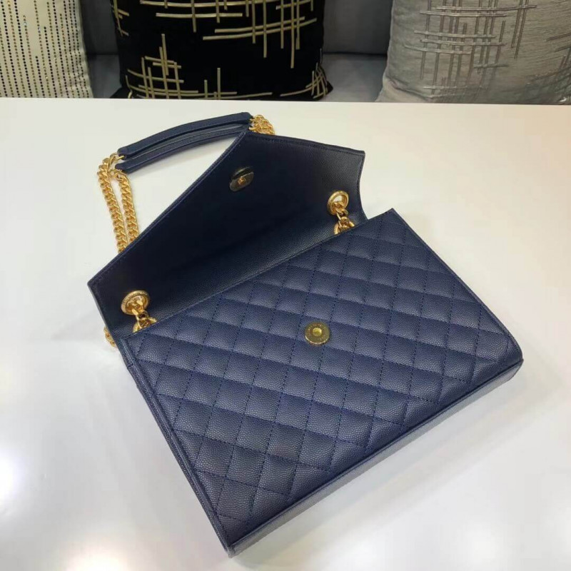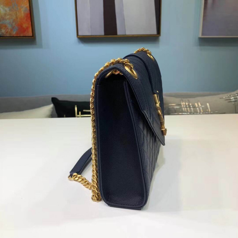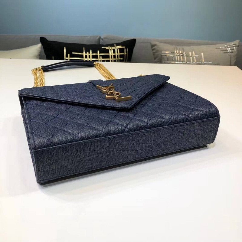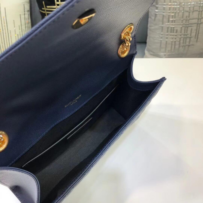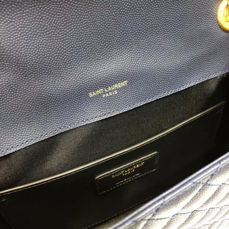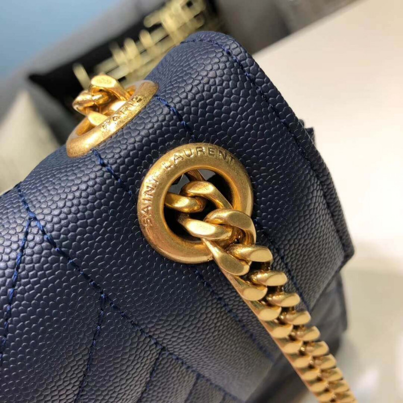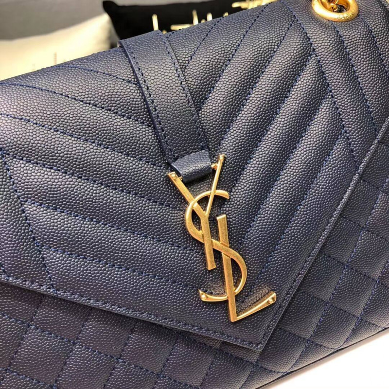 Monogram saint laurent bag with front flap, adorned with metal interlocking ysl initials leather and chain strap, and horizontal and veritcal quilted overstitiching.
