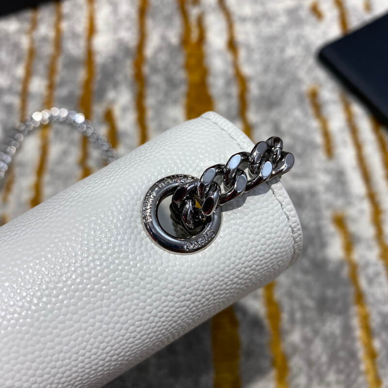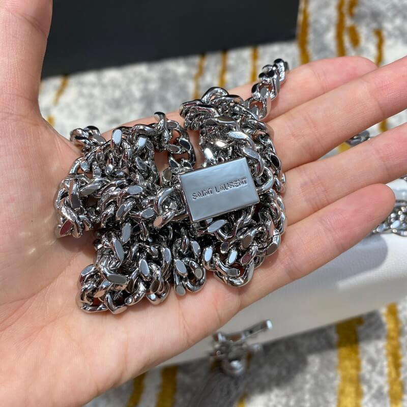 Monogram saint laurent bag adorned with a curb chain, interlocking ysl initials in metal and a metallic tassel.