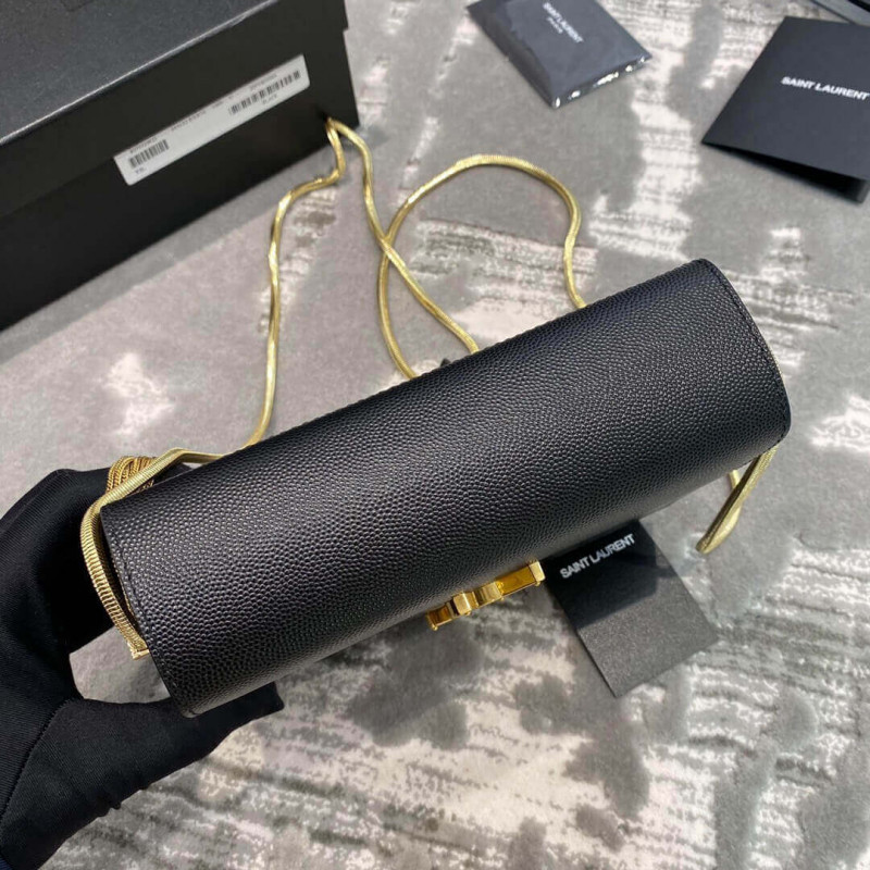 Saint laurent monogram box bag with flap decorated with metal ysl initials and featuring a square omega chain shoulder strap with tassels.- 100% calfskin leather- Gold-toned metal hardware- Leather lining- Magnetic snap closure- Interior: one central gusset compartment, one gusset pocket- Shoulder strap drop: 56 cm