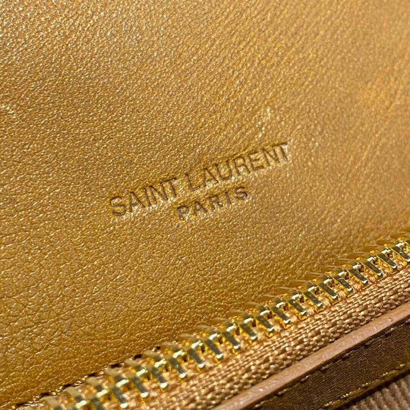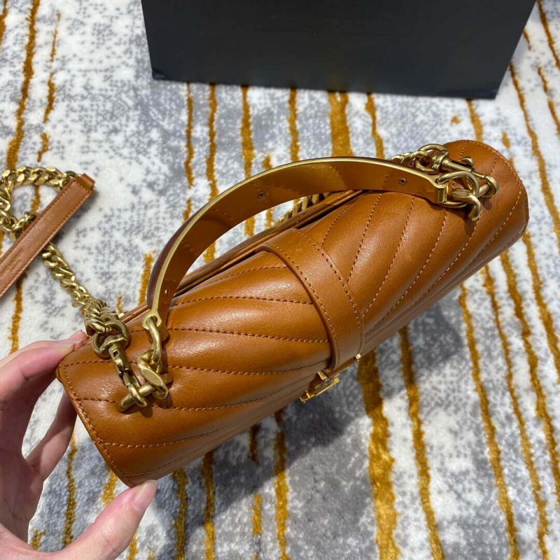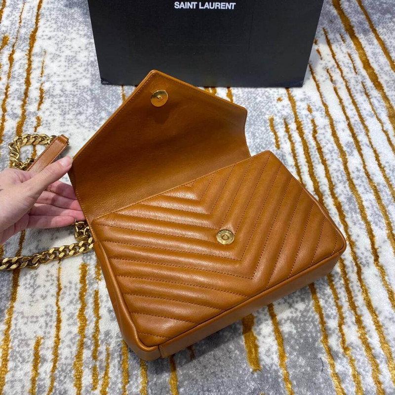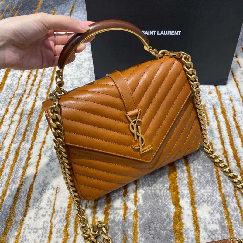 Brown College quilted shoulder bag from Saint Laurent. Size medium. Made of calf leather. Magnetic snap closure. Metal logo at front. Slip pocket at rear. Semi-round handle. Detachable chain strap. Brown, lined interior with 3 compartments – 1 zipped, and 1 card slot. Antiqued gold-tone metal hardware.