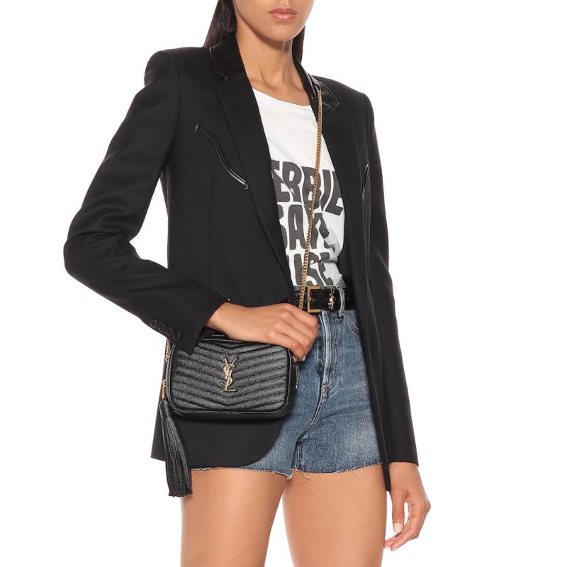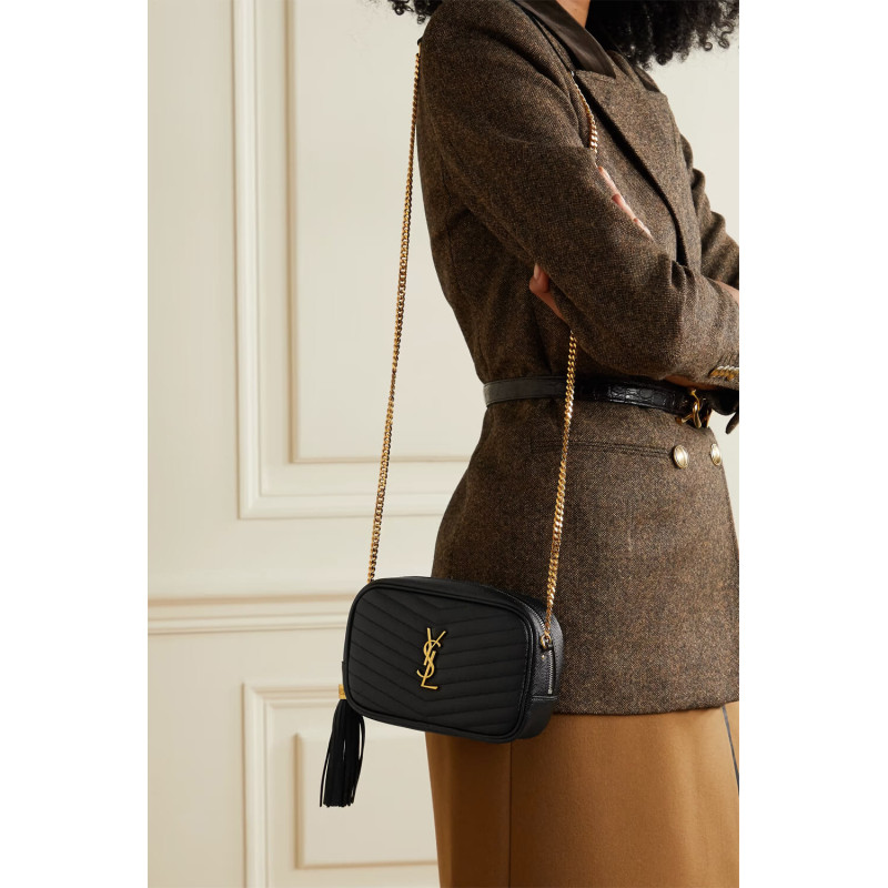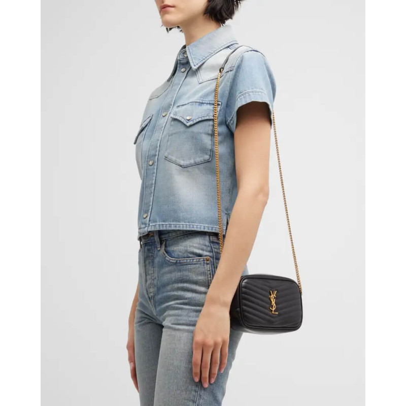 - Saint Laurent "Lou" camera bag in chevron-quilted calf leather with metal YSL monogram on front