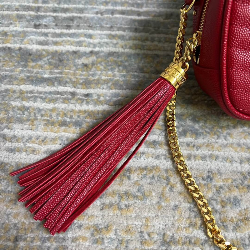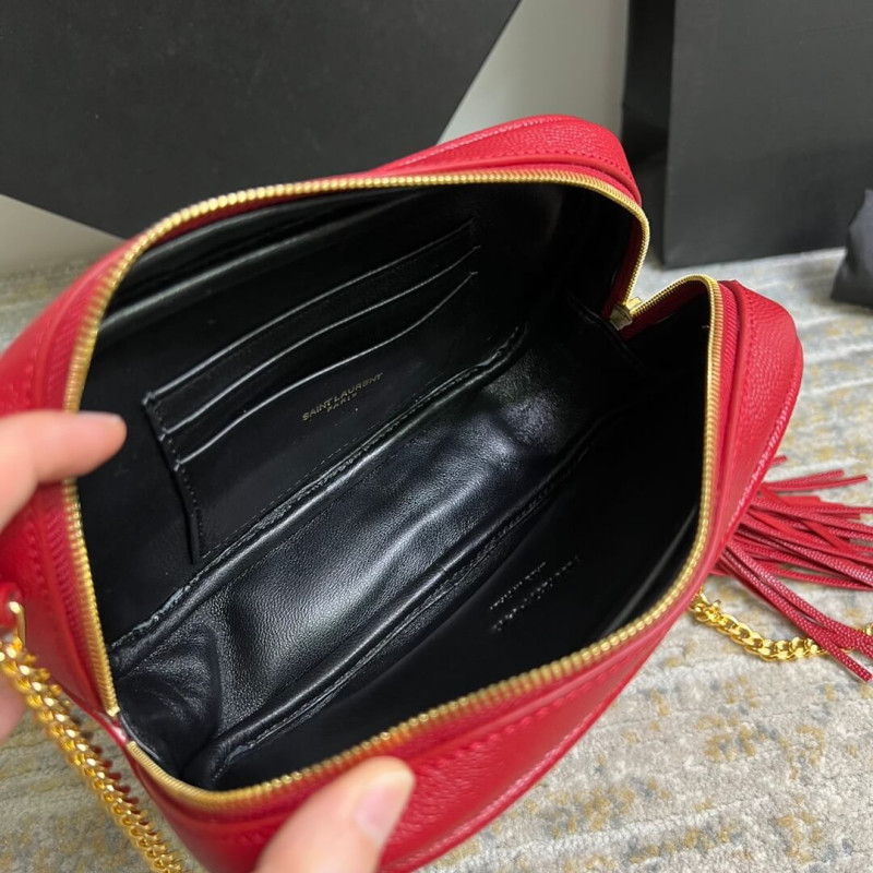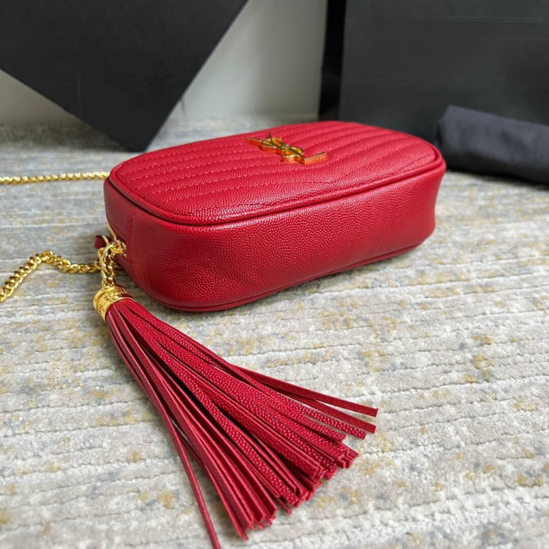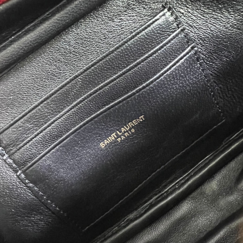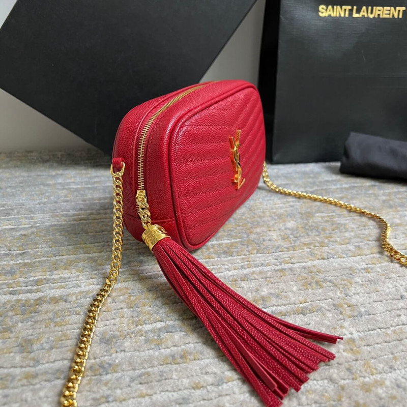- Saint Laurent "Lou" camera bag in chevron-quilted calf leather with metal YSL monogram on front