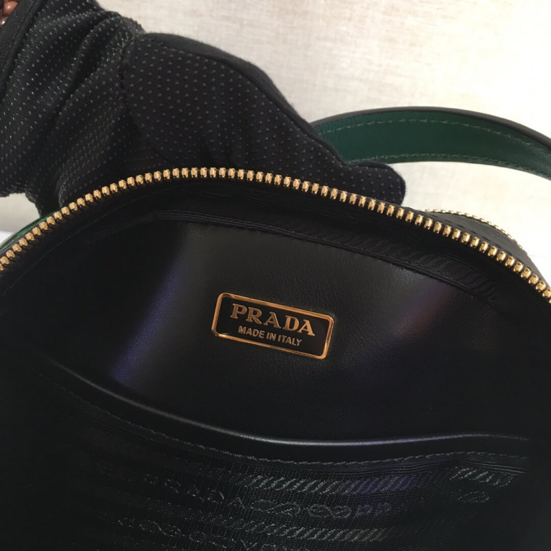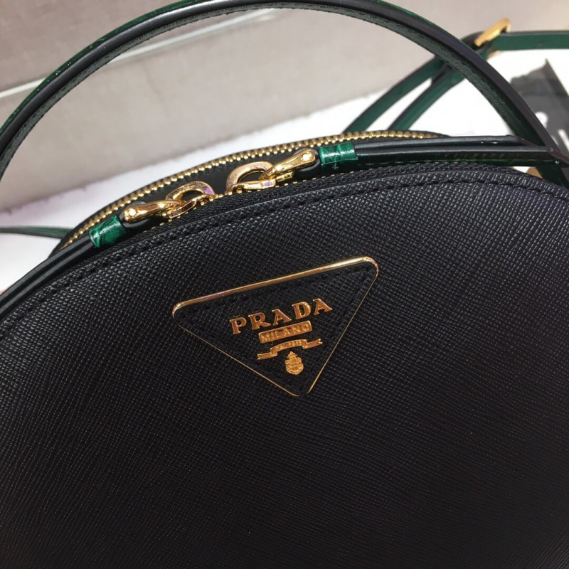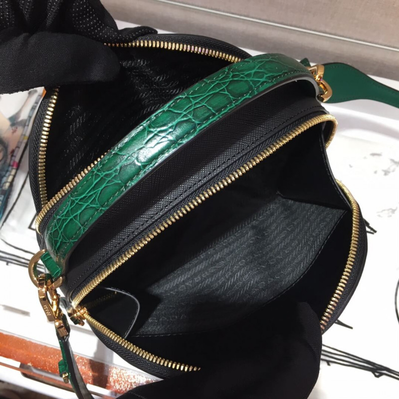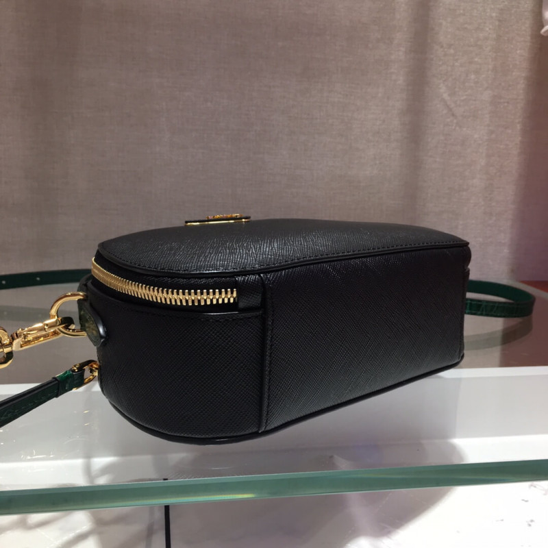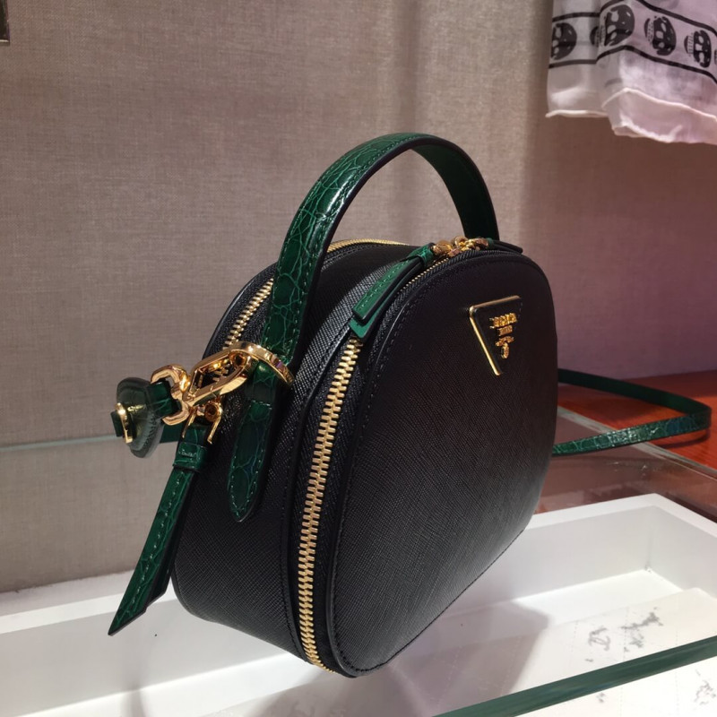 The design of the new Prada Odette bag made of Saffiano leather, carried by hand or worn as a shoulder bag, is inspired by camera cases worn by photographers and reporters. The rounded, minimalist lines of the bag are enhanced by fine crocodile leather trim.