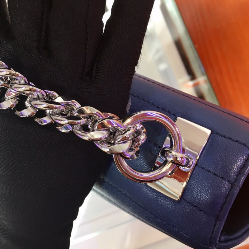 - Sliding metal chain shoulder strap with leather shoulder pad