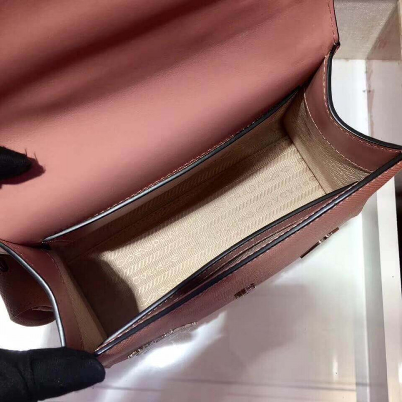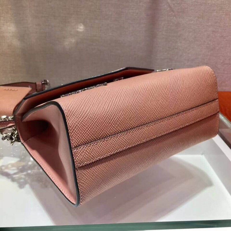 Sleek sophisticated design is the choice for the Prada Monochrome bag in Saffiano leather. The bag has a distinctive tonal metal logo.