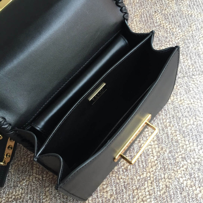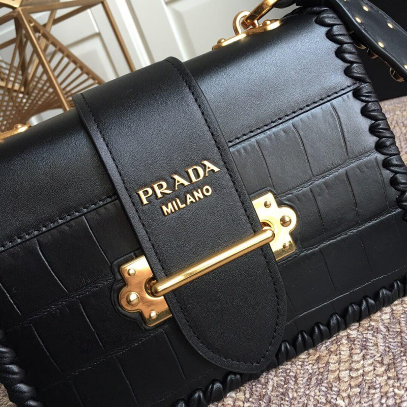 Inspired by valuable ancient books, the Prada Cahier bag, here in a two-tone version, is made of soft calf leather. The metal hardware gives it an unmistakable look, and it comes with a removable shoulder strap.