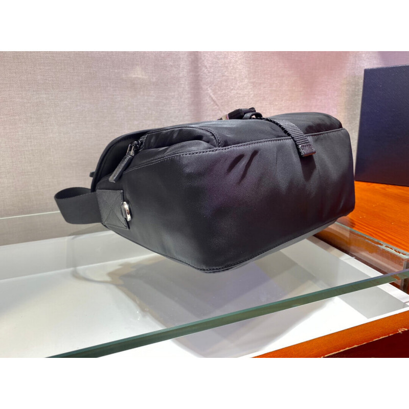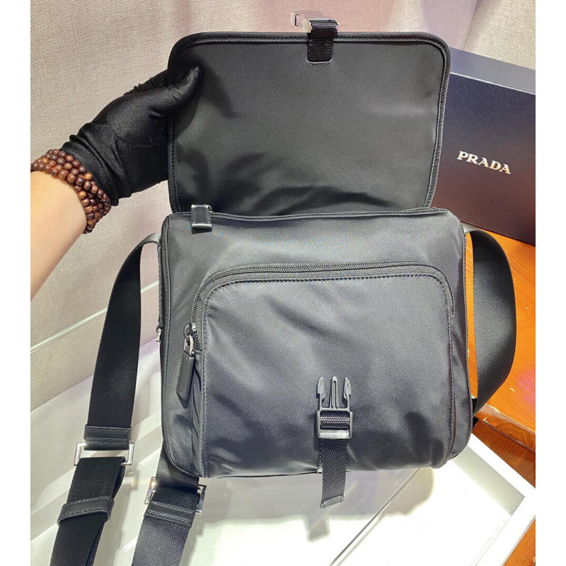 This fabric messenger bag features the Prada logo and steel buckle on the front. The piece is further embellished with Saffiano leather details and contains various pockets, inside and out, with logo lining throughout.