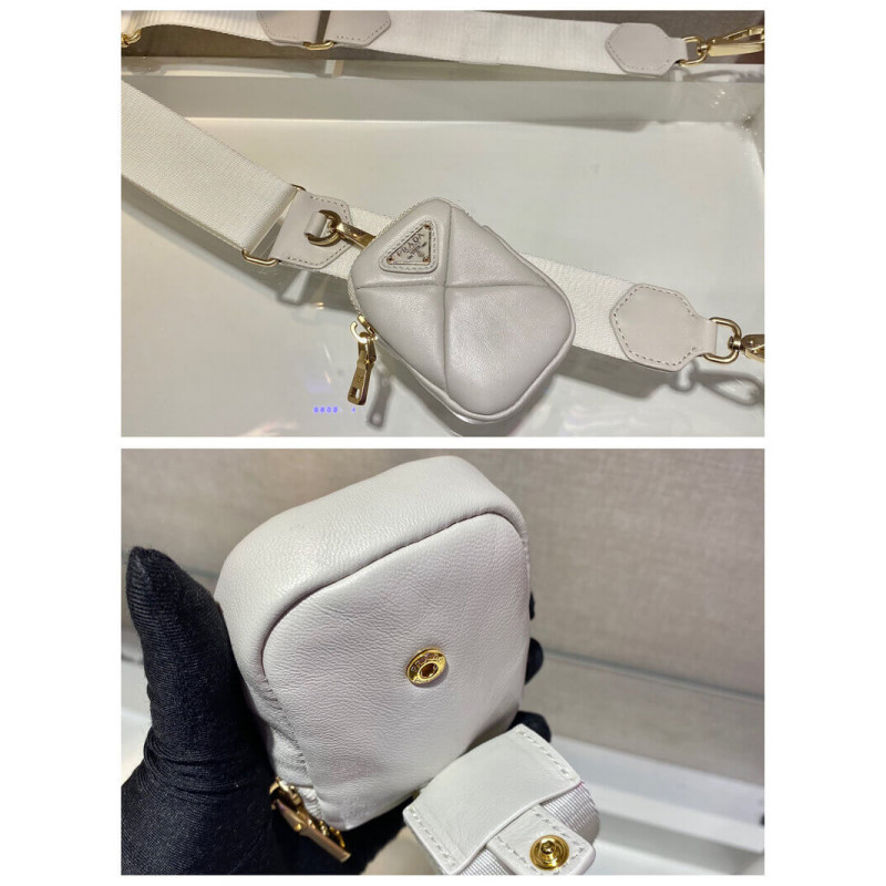 An exquisite patchwork technique, an expression of brand know-how, forms a triangle motif on this Prada System shoulder bag with chain handle. The detachable woven nylon shoulder strap, which allows the accessory to be worn in different ways, has a detachable pouch, a recurring detail of Prada collections.