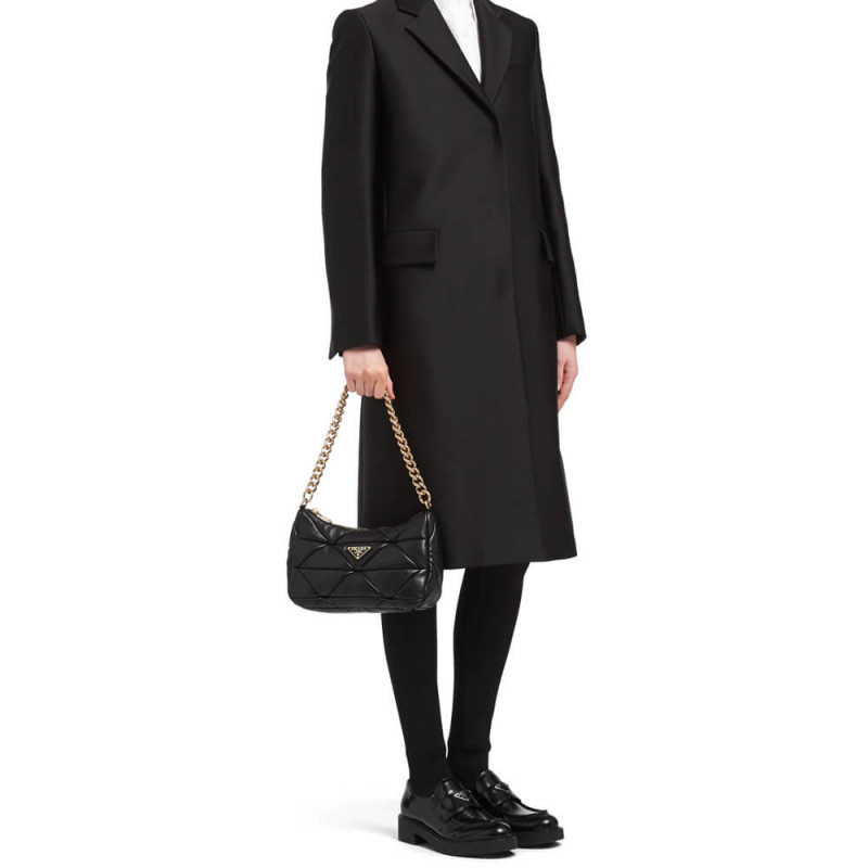 An exquisite patchwork technique, an expression of brand know-how, forms a triangle motif on this Prada System shoulder bag with chain handle. The detachable woven nylon shoulder strap, which allows the accessory to be worn in different ways, has a detachable pouch, a recurring detail of Prada collections.