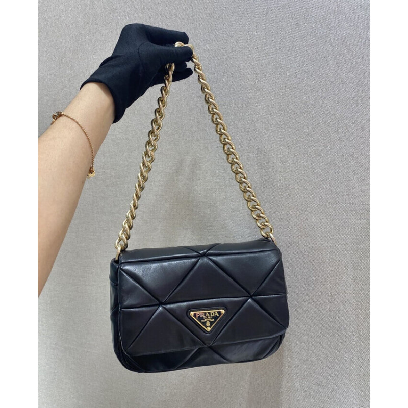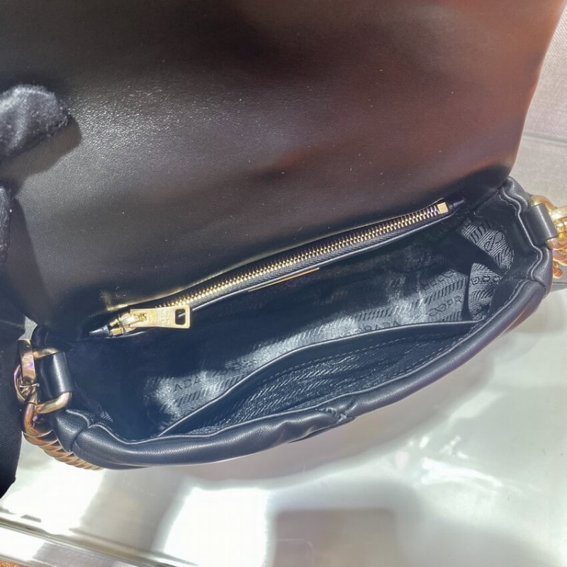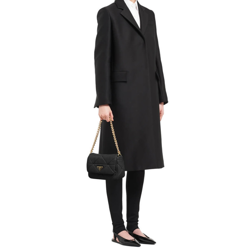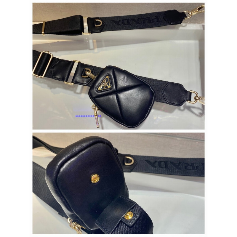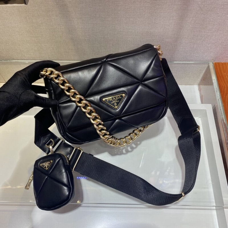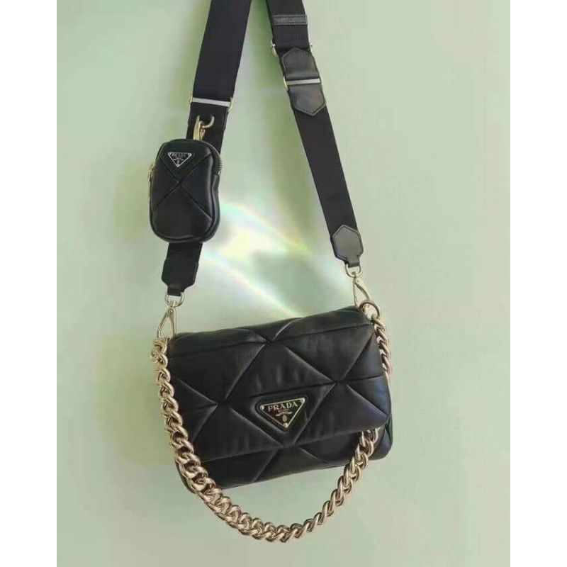 Reinterpreted in always new ways, Prada s iconic triangle appears in the stitched perforated motif of this shoulder bag in soft leather, creating a patchwork pattern. A removable mini-pouch, a distinctive element among the brand s accessories, completes the shoulder bag and adds a contemporary, versatile note to the style.