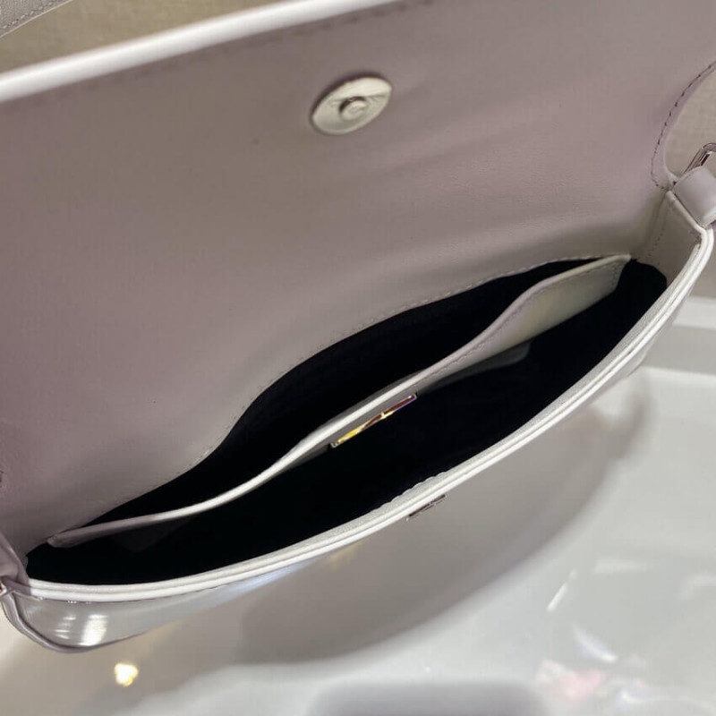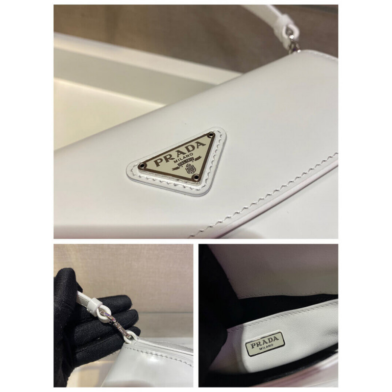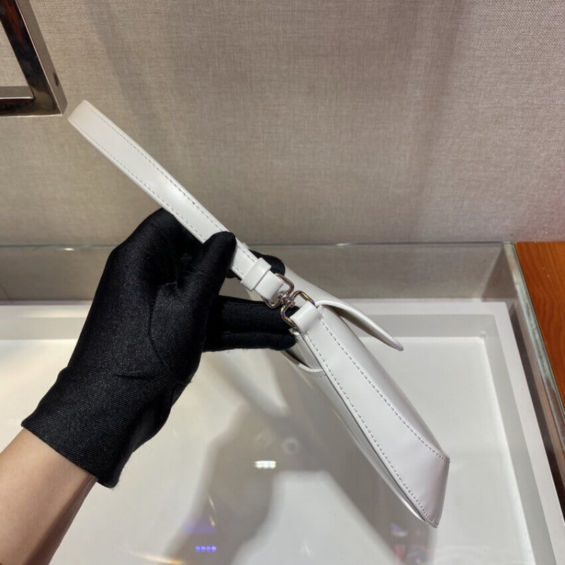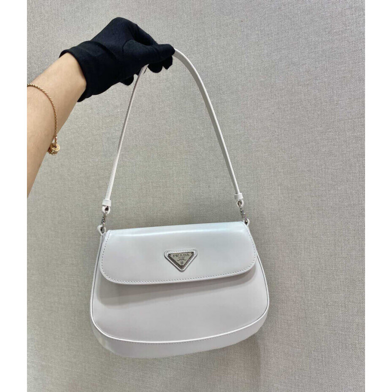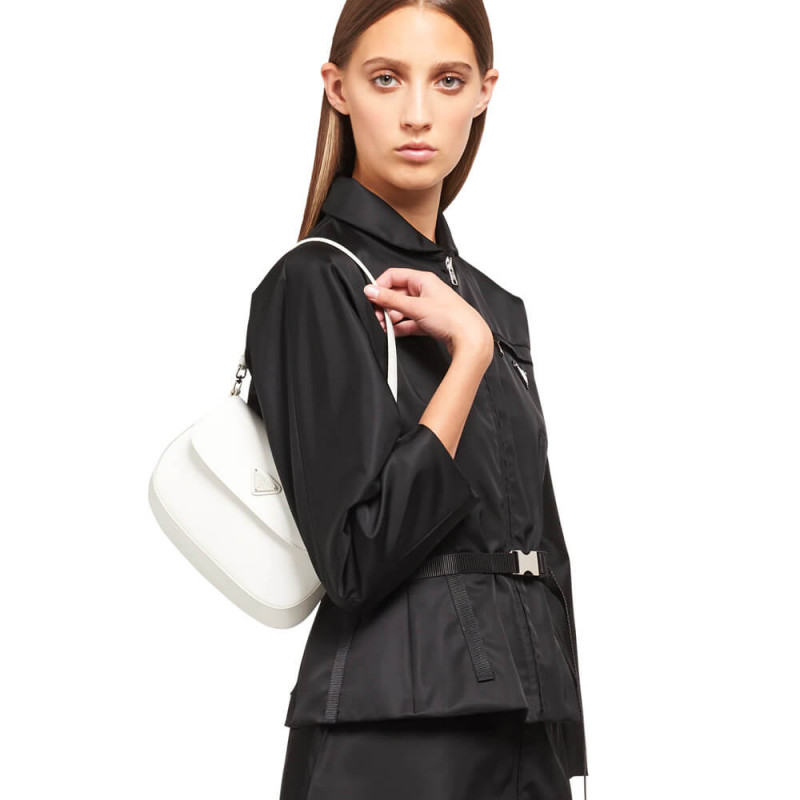 The Prada Cleo bag with sophisticated allure reinterprets an iconic design of the brand from the 1990 s. Sleek curved lines emphasized by the particular construction rounded on the bottom and sides give this flap bag a soft, light look. Brushed leather, a modern and versatile material that is distinctive in Prada collections, is ideal for creating always new combinations and contrasts. The enamel triangle logo decorates the silhouette.
