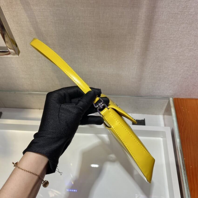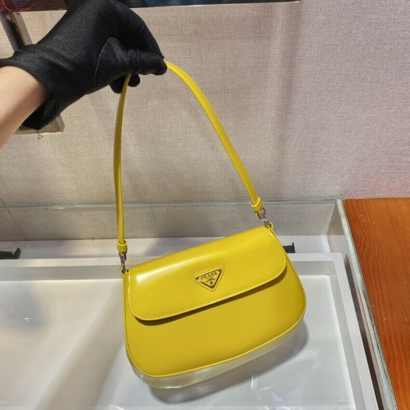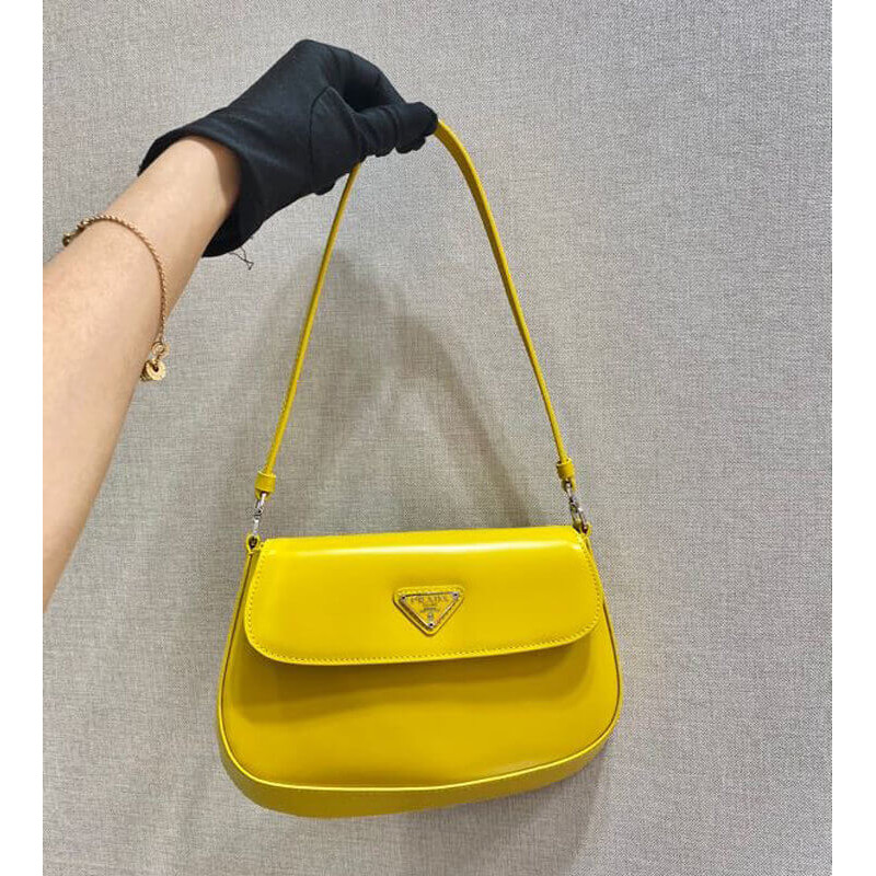The Prada Cleo bag with sophisticated allure reinterprets an iconic design of the brand from the 1990 s. Sleek curved lines emphasized by the particular construction rounded on the bottom and sides give this flap bag a soft, light look. Brushed leather, a modern and versatile material that is distinctive in Prada collections, is ideal for creating always new combinations and contrasts. The enamel triangle logo decorates the silhouette.