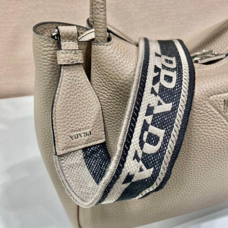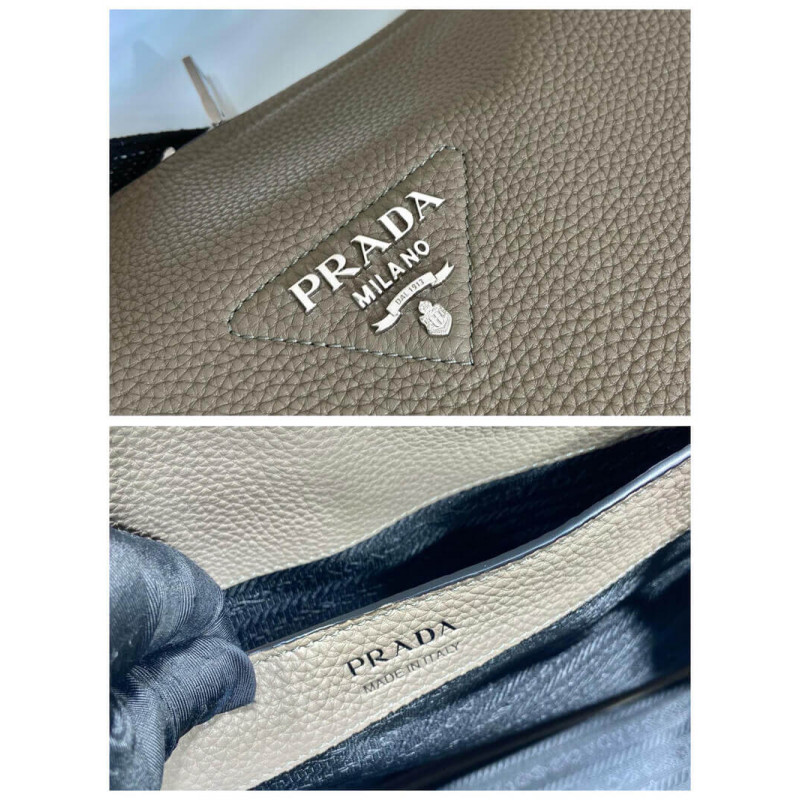 The reverse stitching emphasizes the soft, rounded silhouette of this handbag with a versatile detachable woven tape shoulder strap featuring the logo embroidered in a contrasting color. The accessory is decorated with the new interpretation of the triangle formed by stitching with the Prada metal lettering logo gleaming at its center.