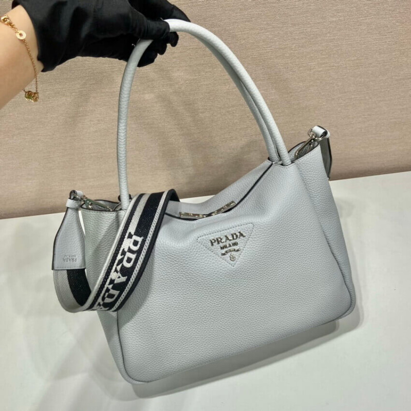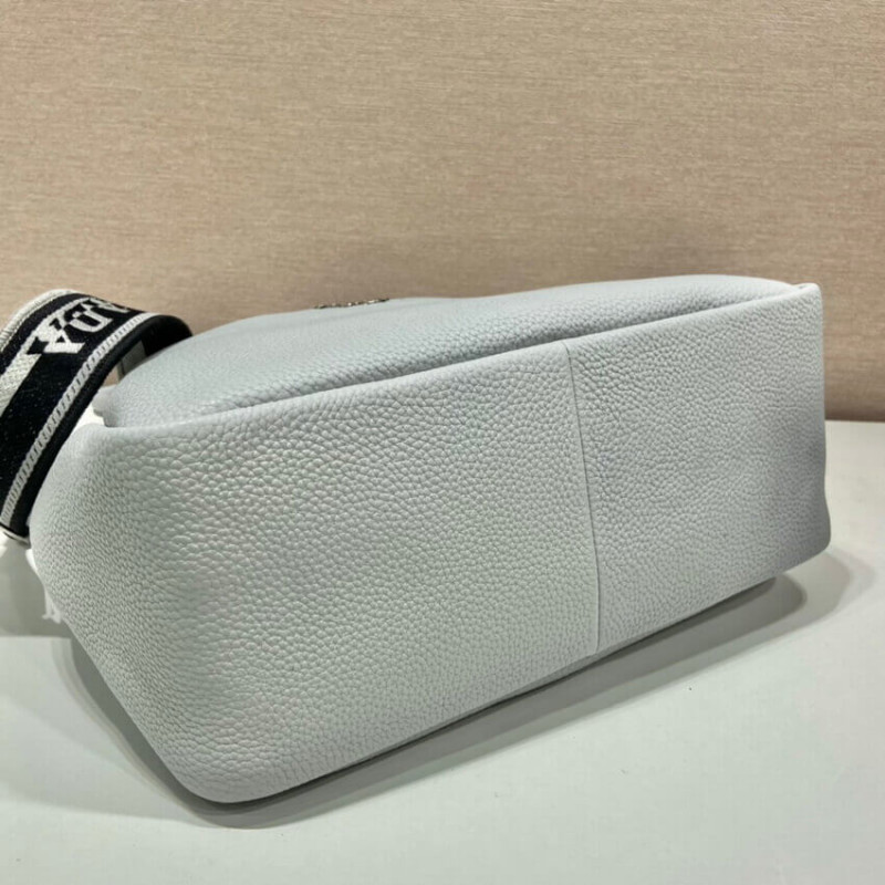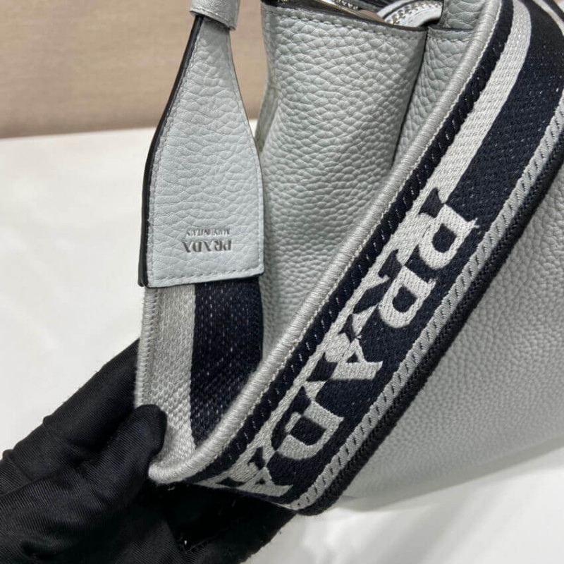 The reverse stitching emphasizes the soft, rounded silhouette of this handbag with a versatile detachable woven tape shoulder strap featuring the logo embroidered in a contrasting color. The accessory is decorated with the new interpretation of the triangle formed by stitching with the Prada metal lettering logo gleaming at its center.