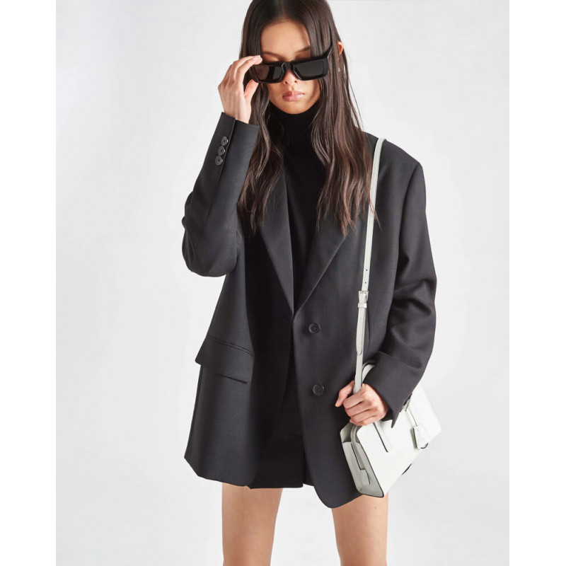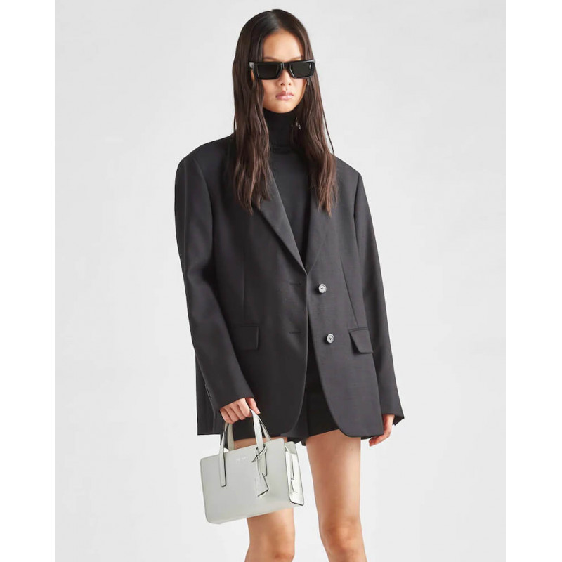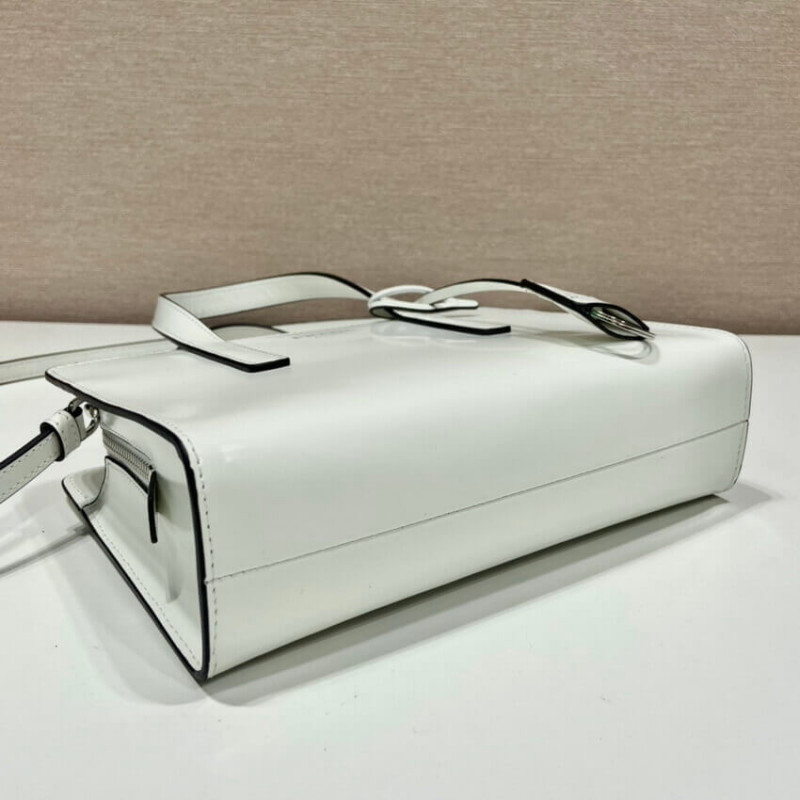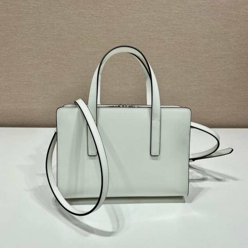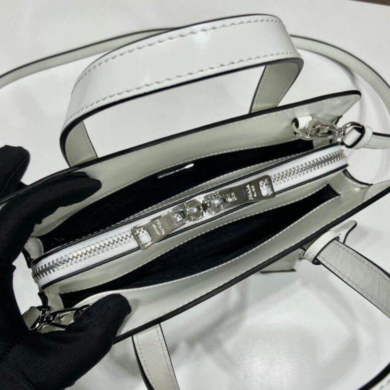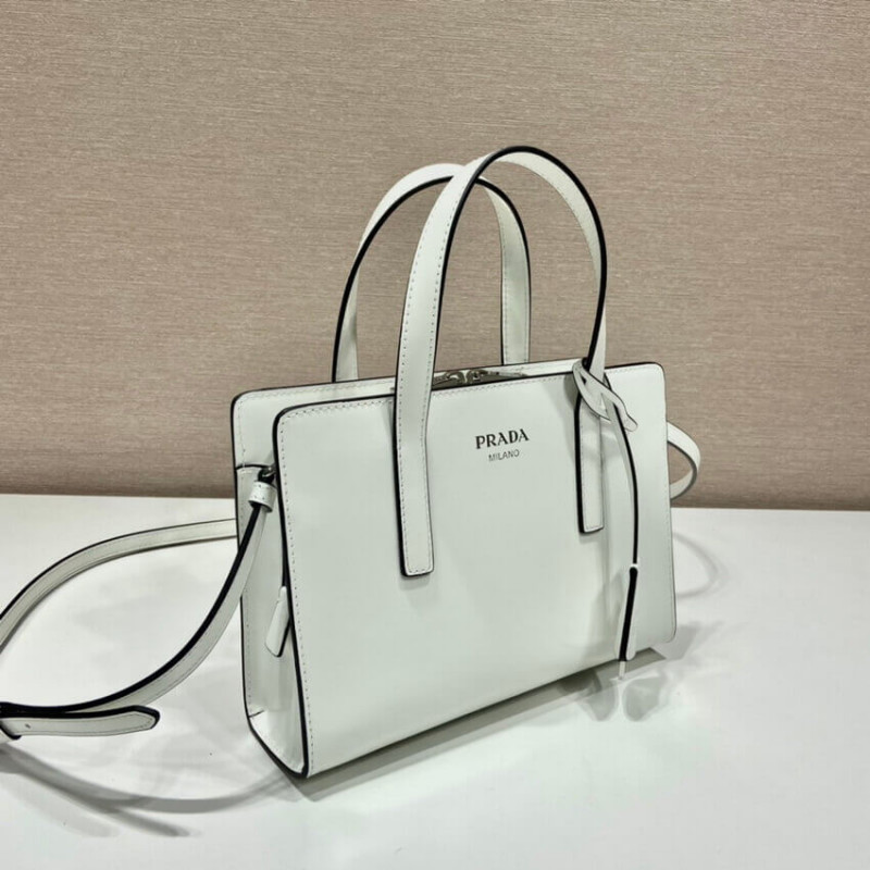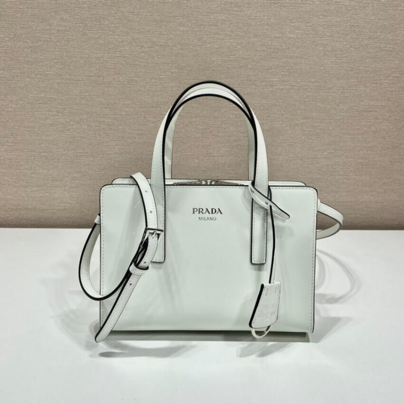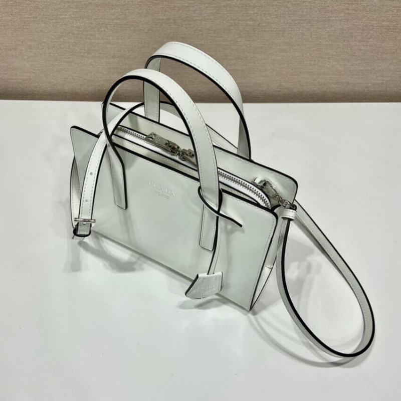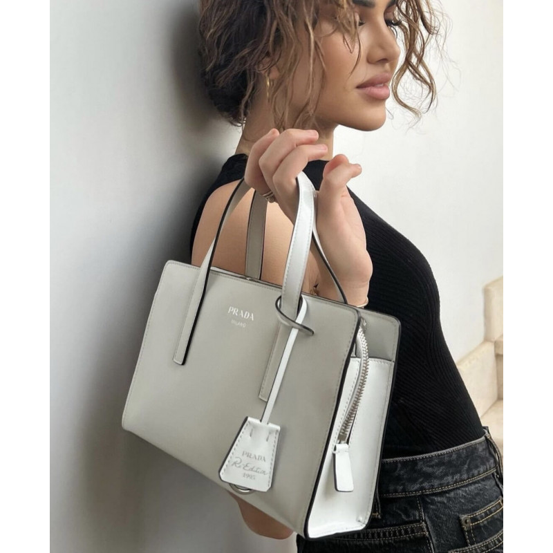 This handbag, a re-edition of an iconic Prada bag of 1995, is characterized by its elegant geometric silhouette with distinct, minimalist lines. Formal allure and practicality meet in its design with a central zipper closure, enhanced by the sophisticated accent of the screen-printed lettering logo. The accessory is made of fine brushed leather, an expression of the brand s expertise.