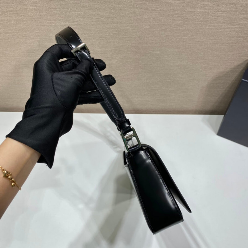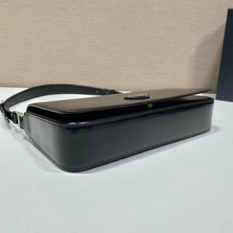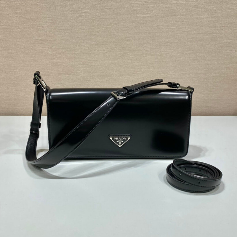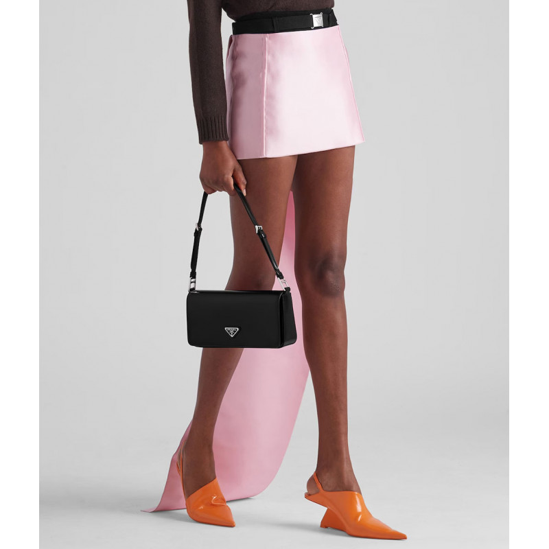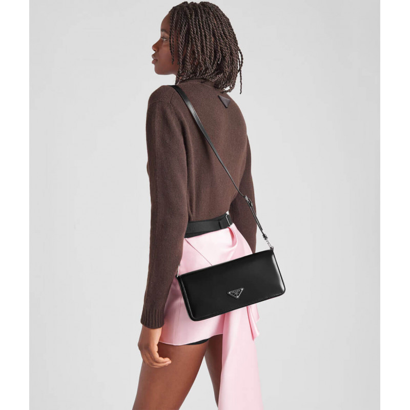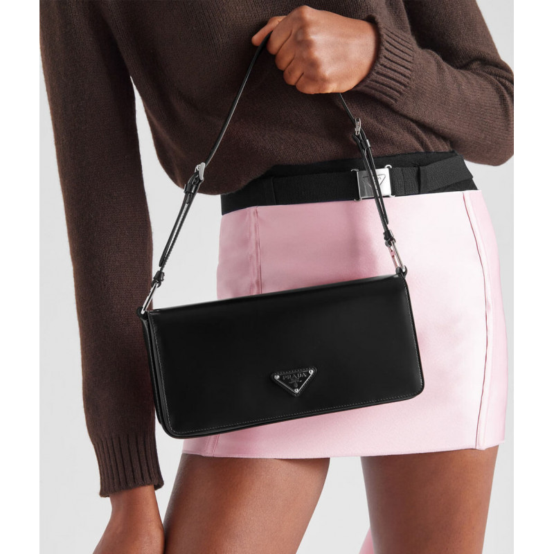 Minimalist elegance, a distinctive character and versatility meet in this shoulder bag with flap that reinterprets the geometric shape of the 90s in a modern, current way. Made of fine brushed leather, an iconic material of Prada collections, the design with a horizontal line features a narrow adjustable shoulder strap that allows it to be worn as a crossbody or shoulder bag. The rectangular silhouette is decorated with the emblematic enameled metal triangle logo.