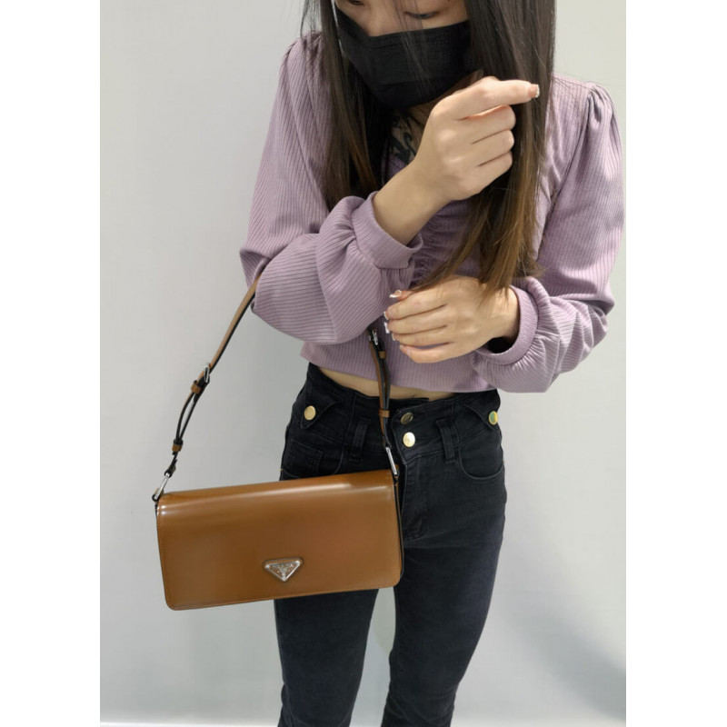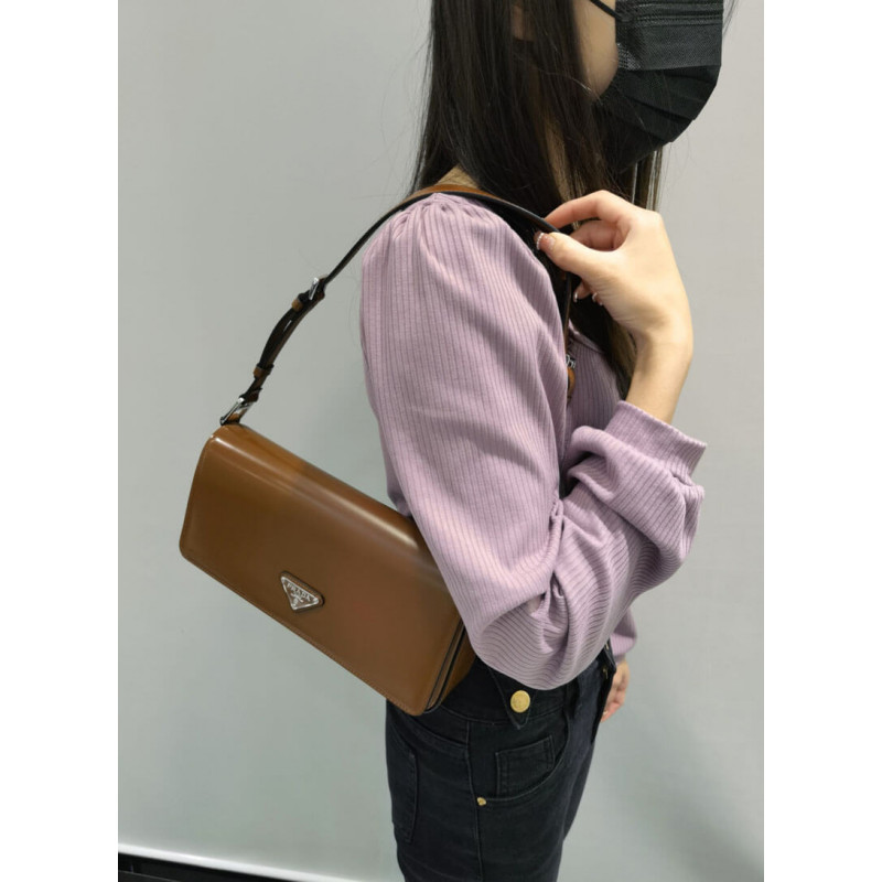 Minimalist elegance, a distinctive character and versatility meet in this shoulder bag with flap that reinterprets the geometric shape of the 90s in a modern, current way. Made of fine brushed leather, an iconic material of Prada collections, the design with a horizontal line features a narrow adjustable shoulder strap that allows it to be worn as a crossbody or shoulder bag. The rectangular silhouette is decorated with the emblematic enameled metal triangle logo.