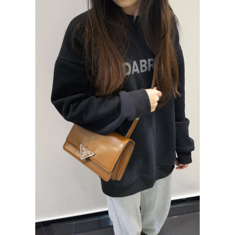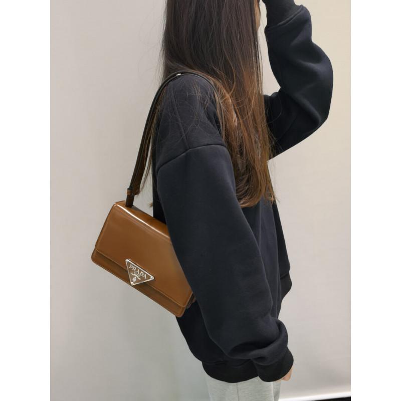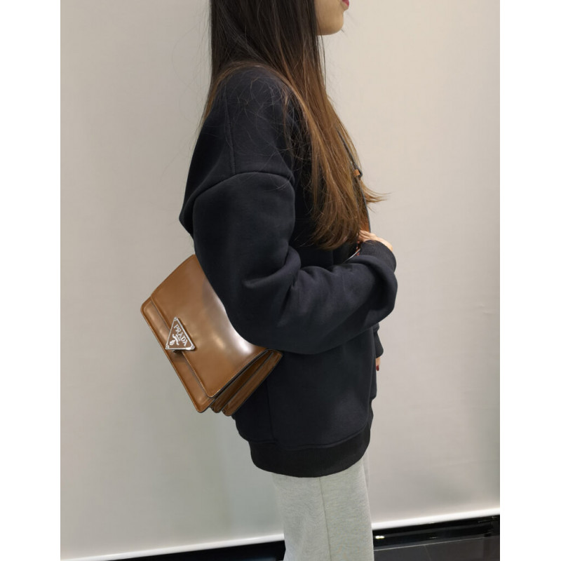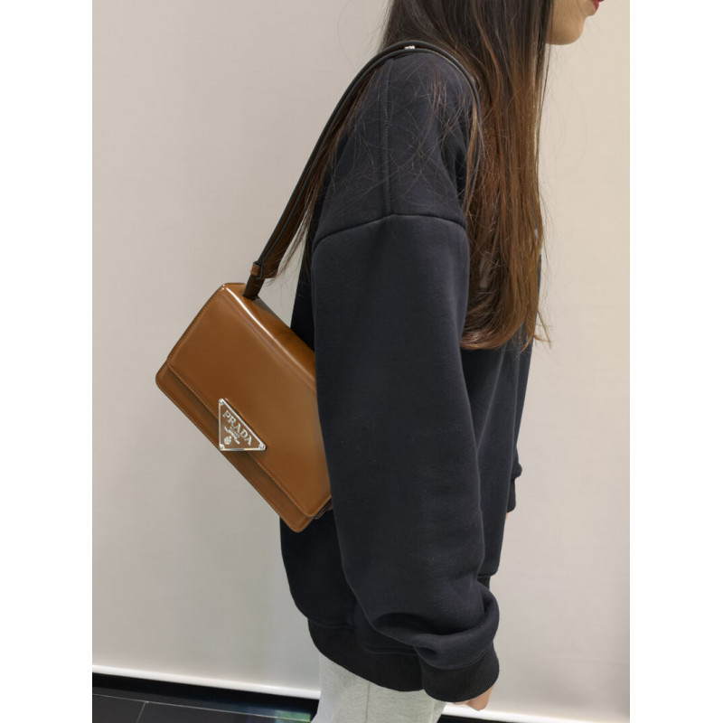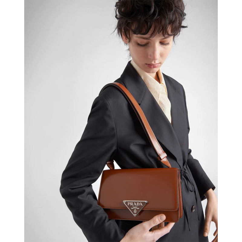 Presented in a macro version for a bold, contemporary effect, the enameled metal triangle logo stands out on the flap of this shoulder bag made of brushed leather, an iconic and luxurious material of the brand. Modern elegance and versatility meet in the rectangular design, completed by an adjustable leather shoulder strap to be worn in different ways.