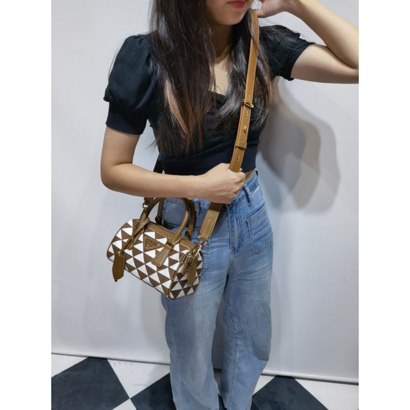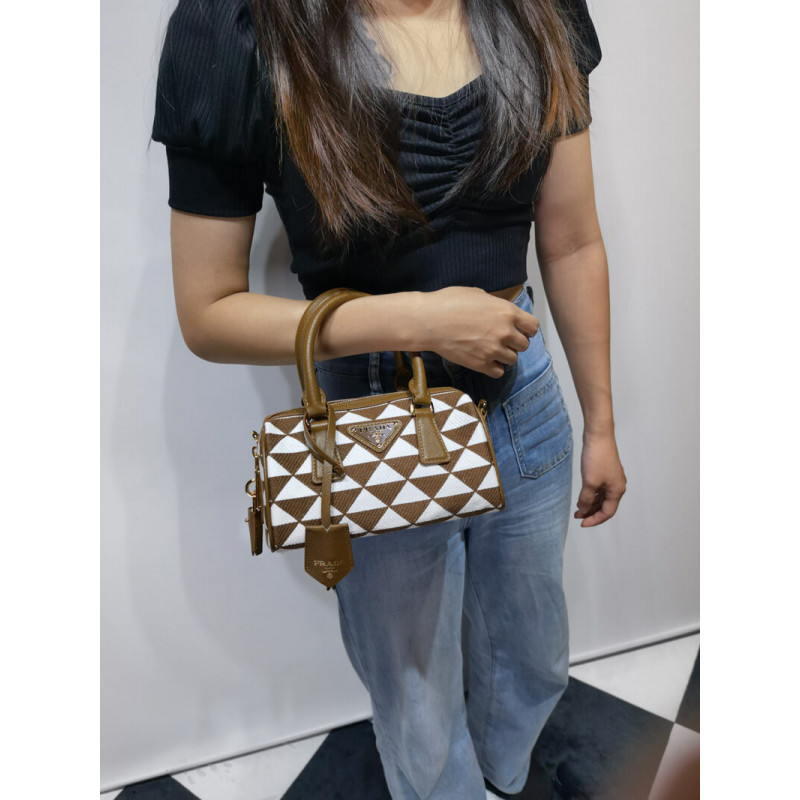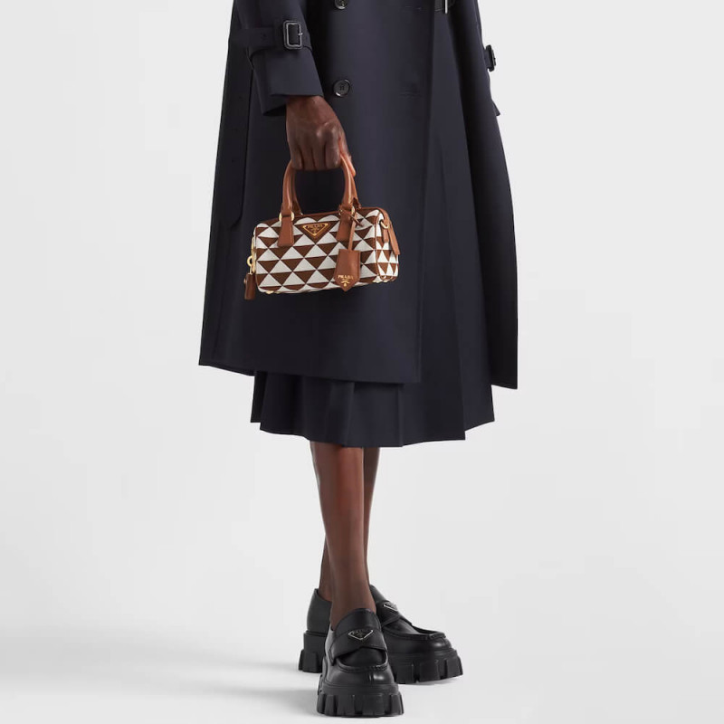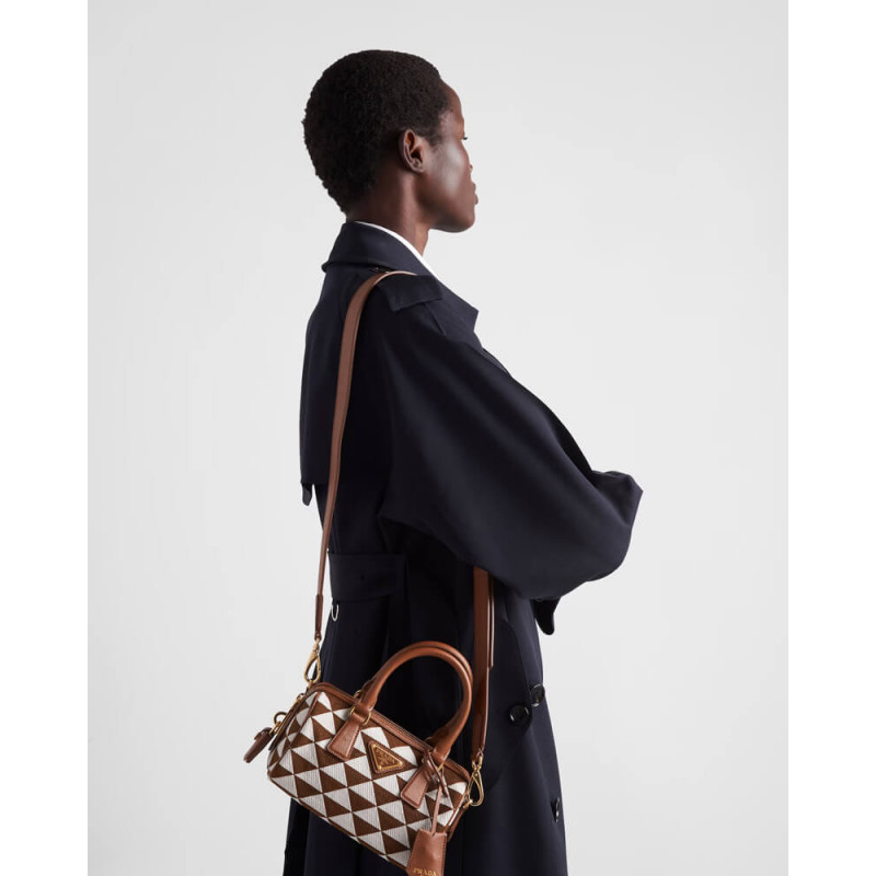 Prada Symbole Embroidered Fabric Top-Handle Bag 1BB846 Tobacco/Chalk White
