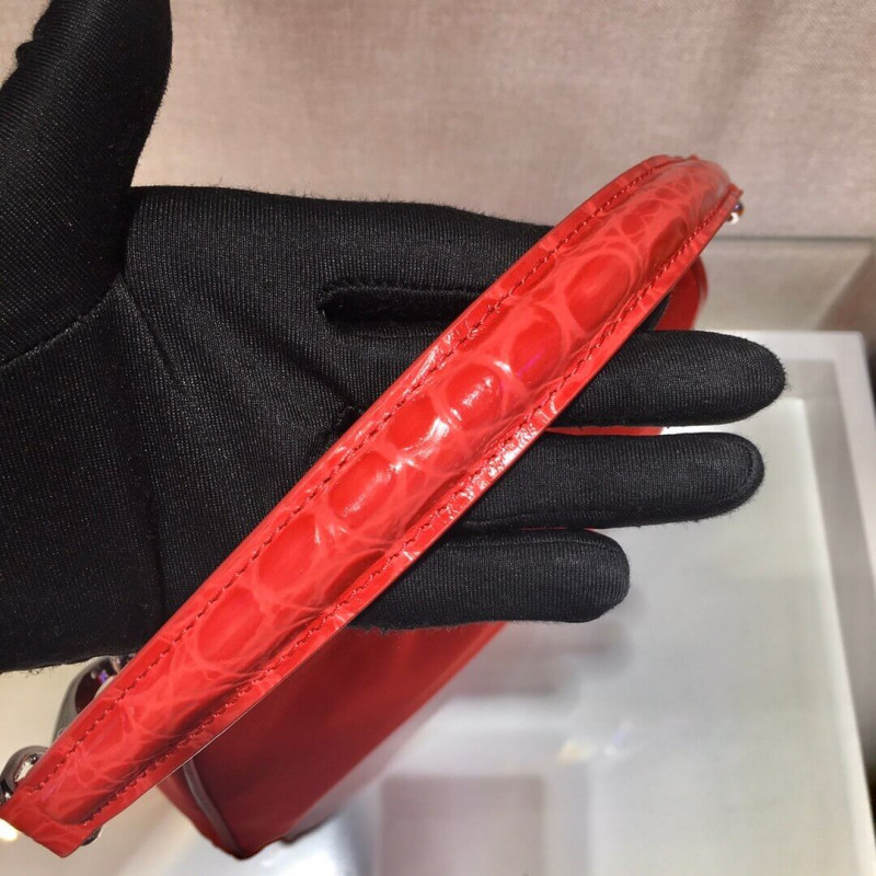 This nylon shoulder bag with handle in fine crocodile leather is characterized by its harmonious shape. The accessory with zipper closure and nylon lining is decorated with the metal triangle logo.