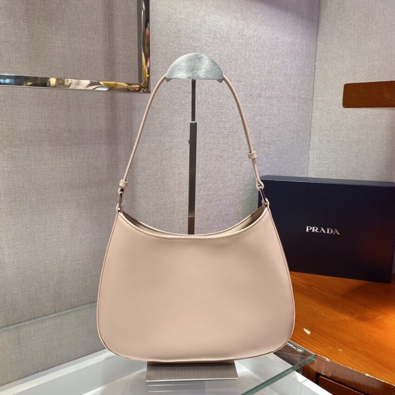 The Prada Cleo bag with sophisticated allure reinterprets an iconic design of the brand from the 1990 s. Sleek curved lines emphasized by the particular construction rounded on the bottom and sides give this hobo bag a soft, light look. Brushed leather, a modern and versatile material that is distinctive in Prada collections, is ideal for creating always new combinations and contrasts. The enamel triangle logo decorates the silhouette.