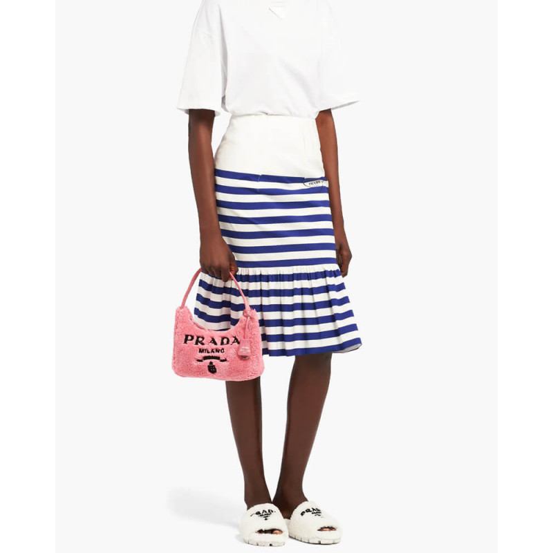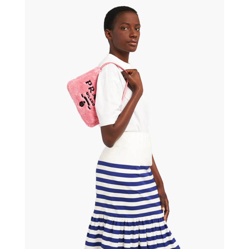 Vivid color contrasts and an ironic character define the Re-Edition 2000 mini hobo bag in soft terry with a summery mood. Prada s iconic lettering logo embroidered on the front embellishes the silhouette, a reinterpretation of a historic style of the brand.
