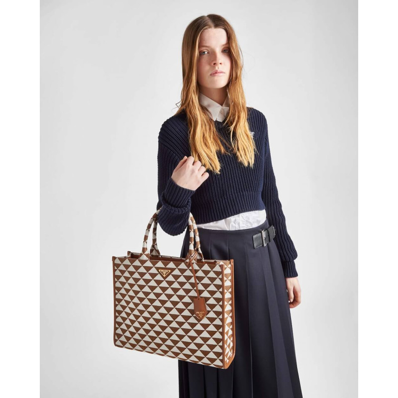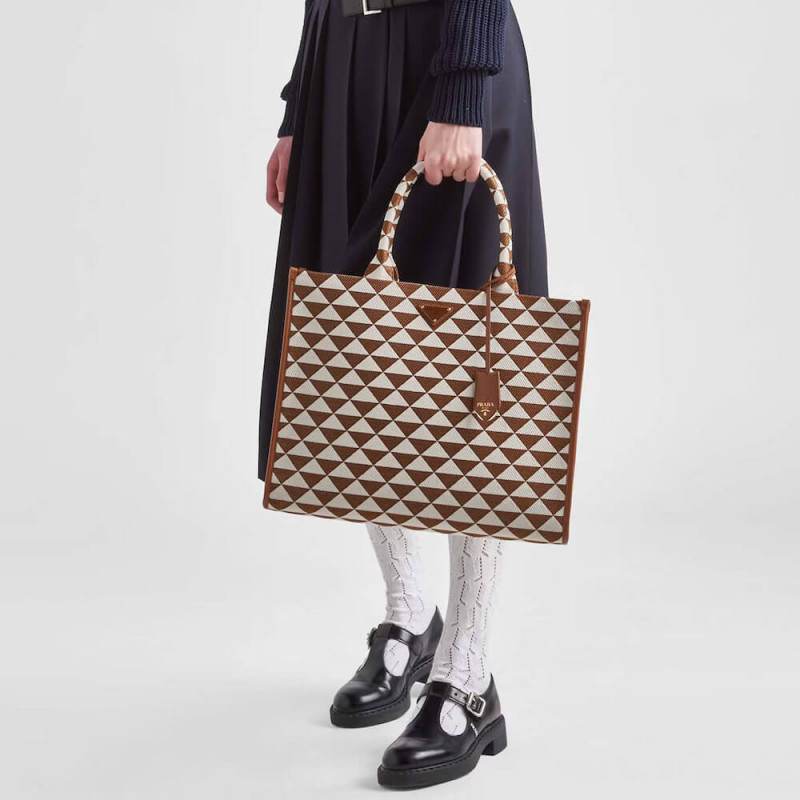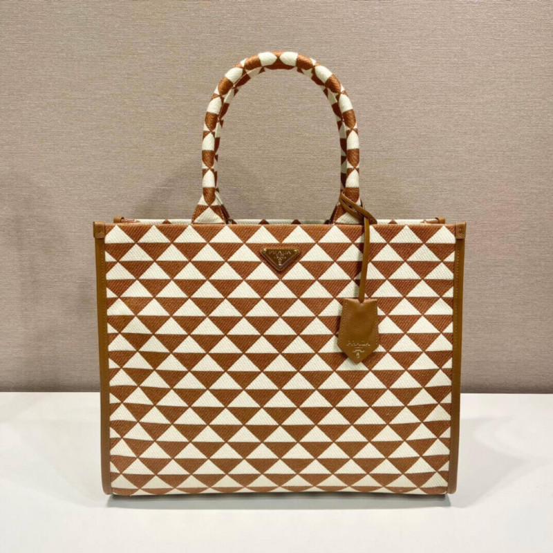 Prada Large Symbole Embroidered Fabric Handbag 1BA356 Tobacco/Chalk White