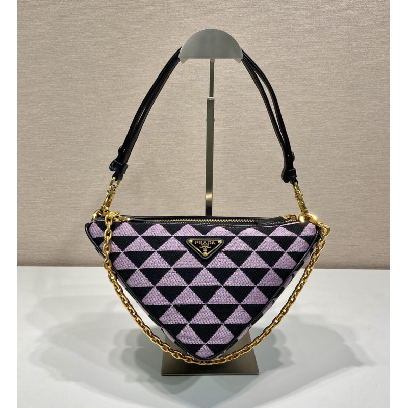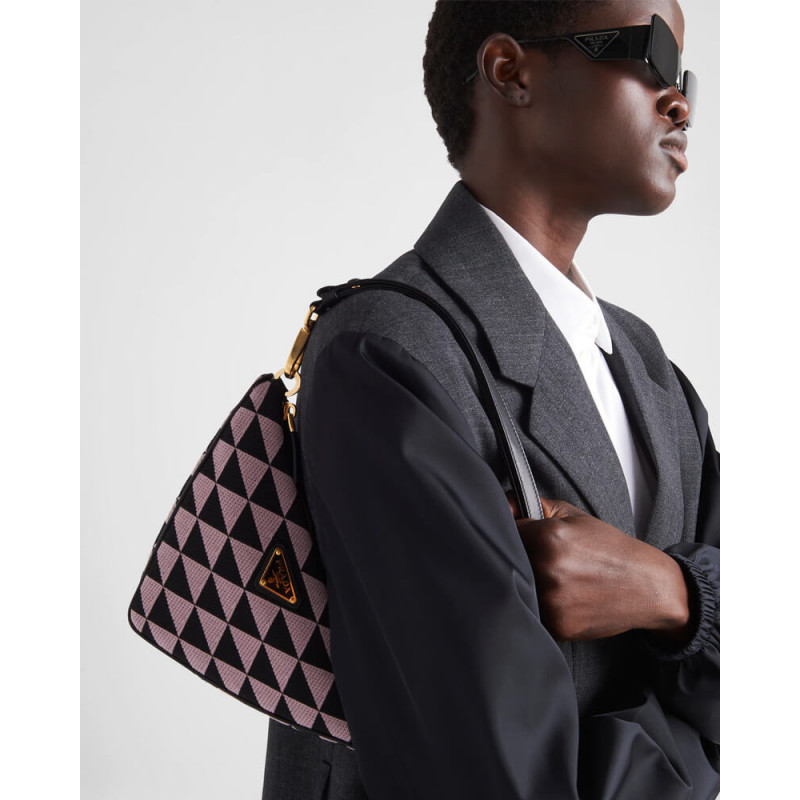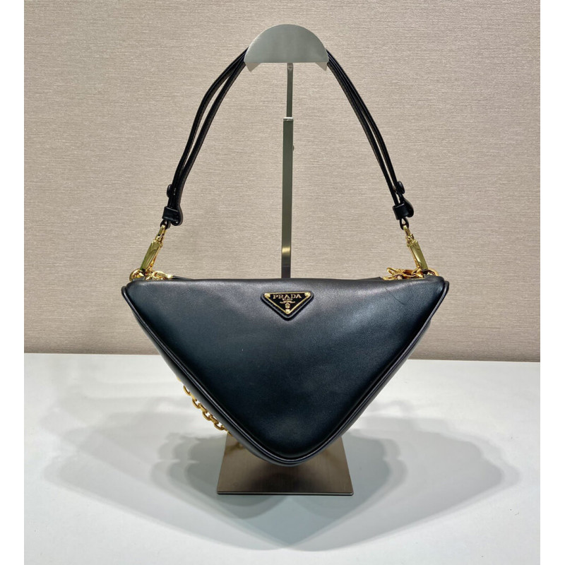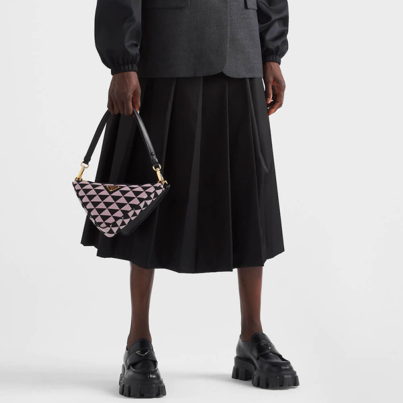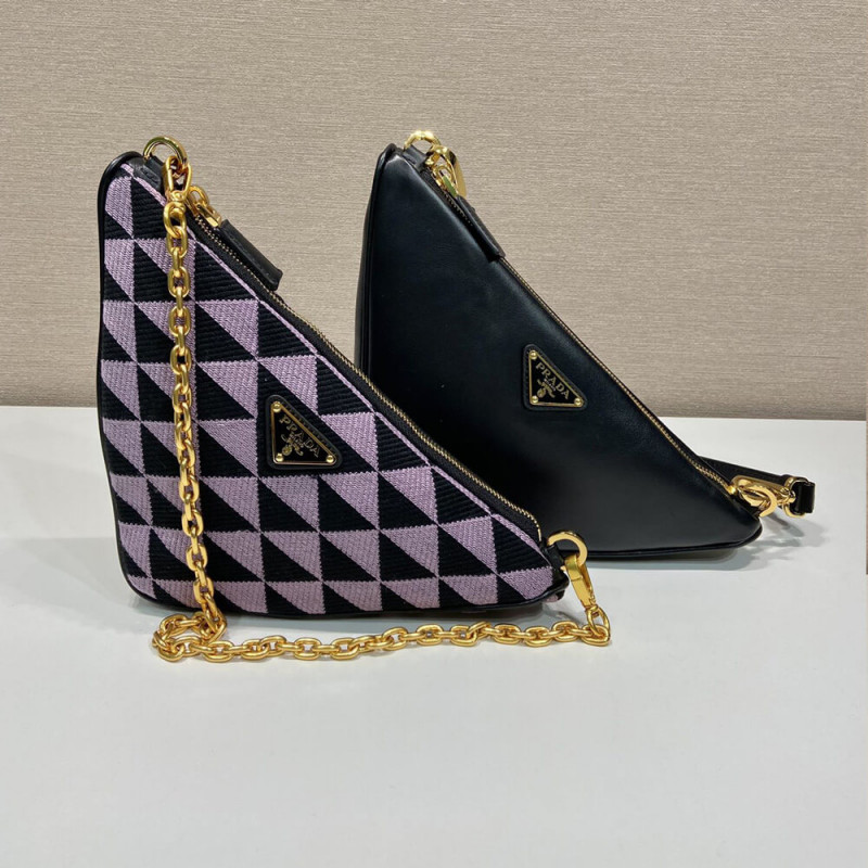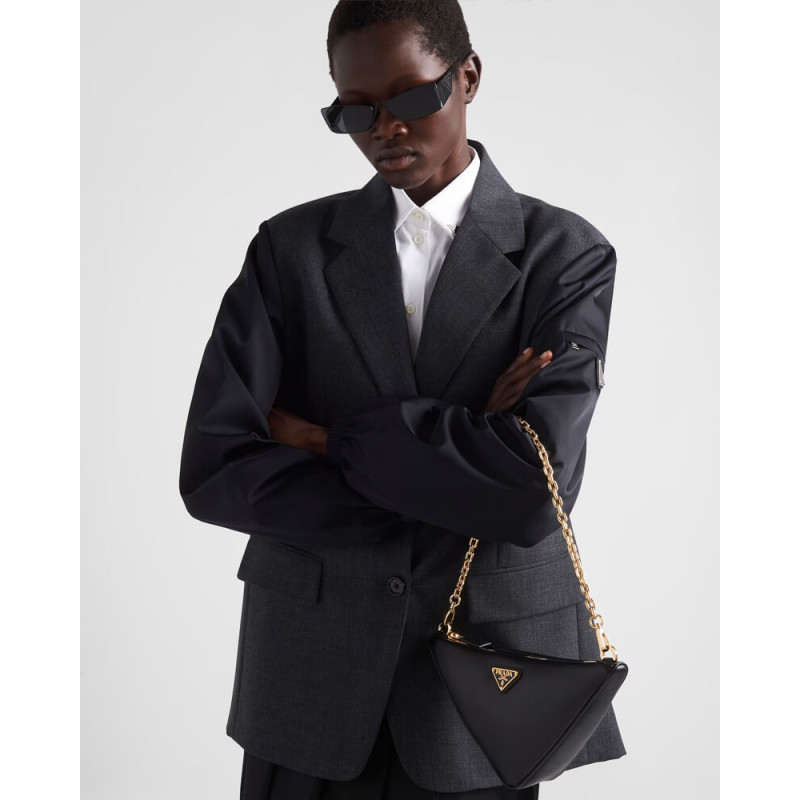 Introduced for the first time on trunks designed by Mario Prada, the Prada triangle expresses uniqueness and modernity through its minimalist and universal silhouette, reinvented in a different way every season. Its geometric shape inspires this mini bag with a modernist and modular design that lets it be worn in a variety of ways: the two triangles in leather and fabric that compose it can be separated and worn as single handbags or, when the handles are removed, as clutches.