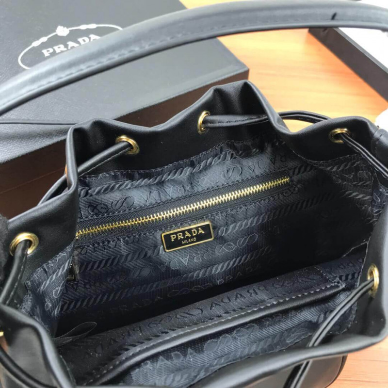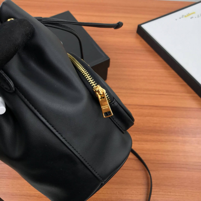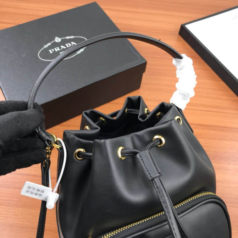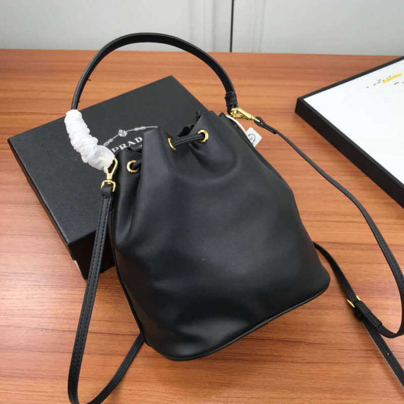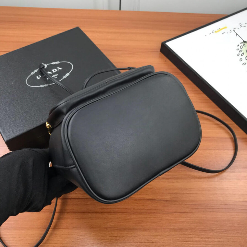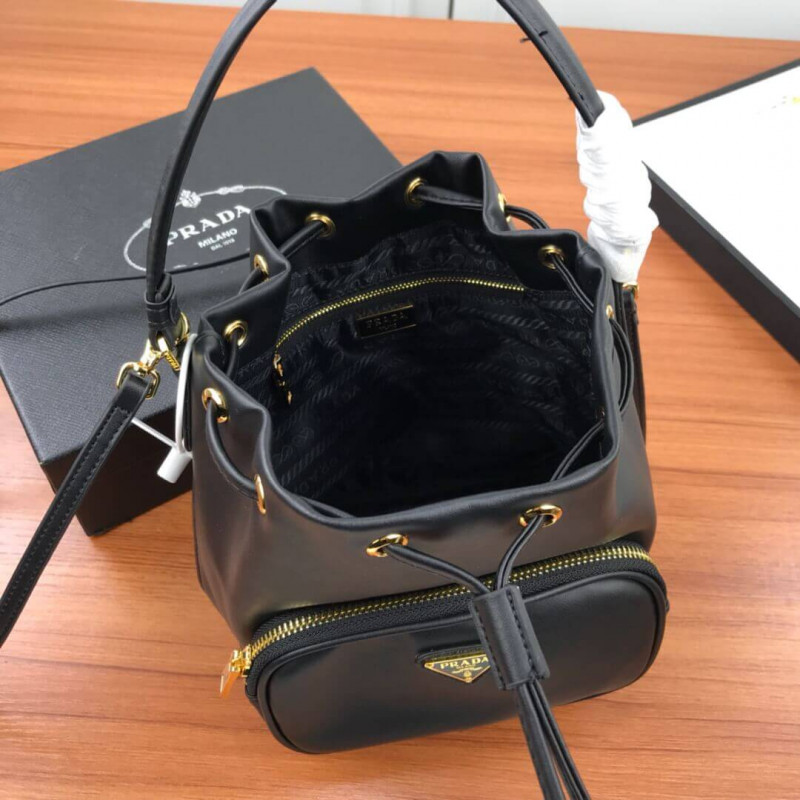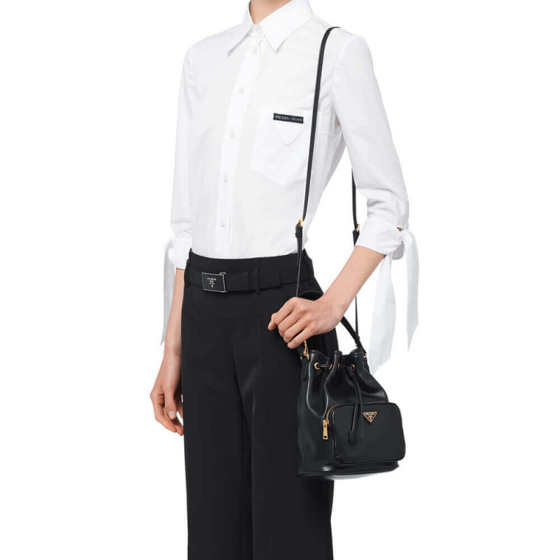 This leather bucket bag with a soft, contemporary shape can be worn as a handbag or crossbody bag thanks to the Saffiano leather handle and shoulder strap. The classic silhouette has an outside pocket and enamel triangle logo.