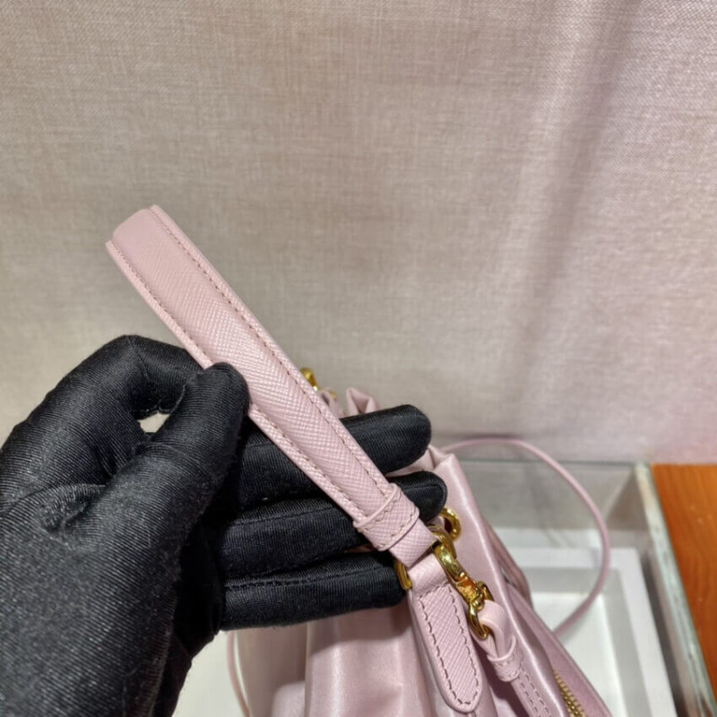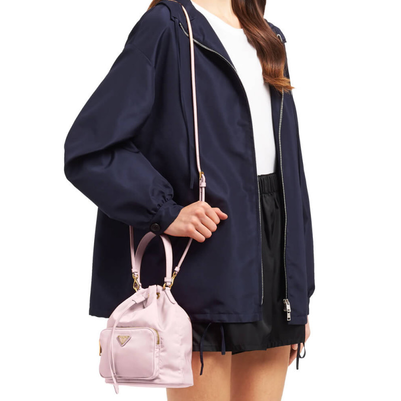 This leather bucket bag with a soft, contemporary shape can be worn as a handbag or crossbody bag thanks to the Saffiano leather handle and shoulder strap. The classic silhouette has an outside pocket and enamel triangle logo.