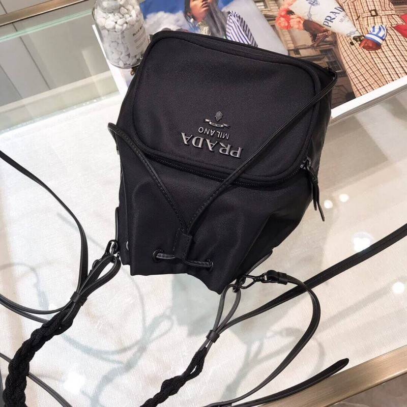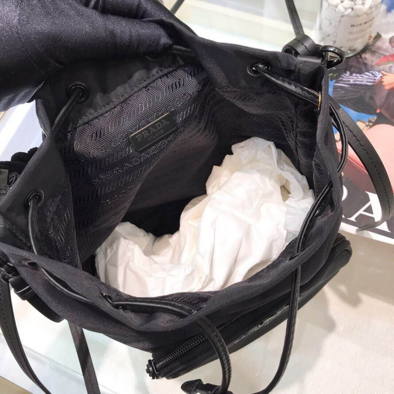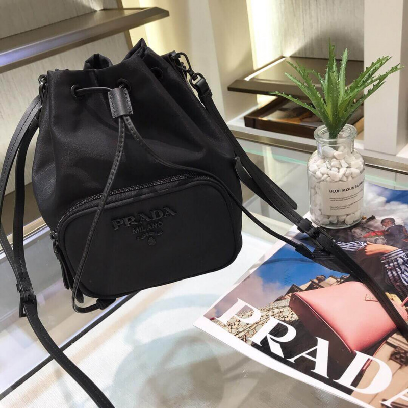 This bucket bag has a modern, feminine design. The Prada Duet bag stands out for its braided trim and nappa leather handle. The bag comes with a shoulder strap.