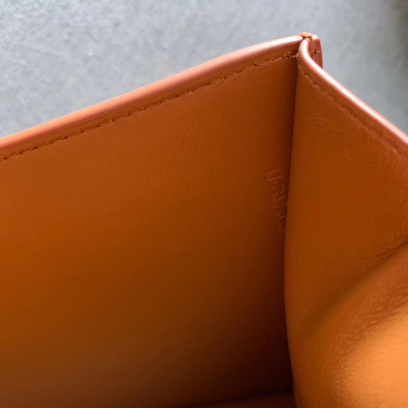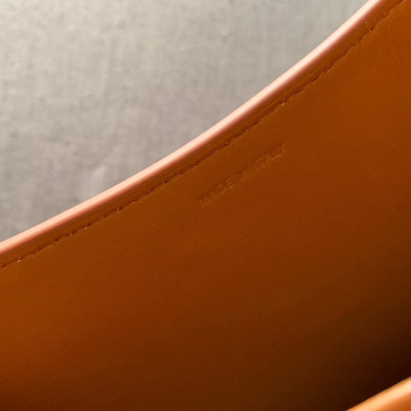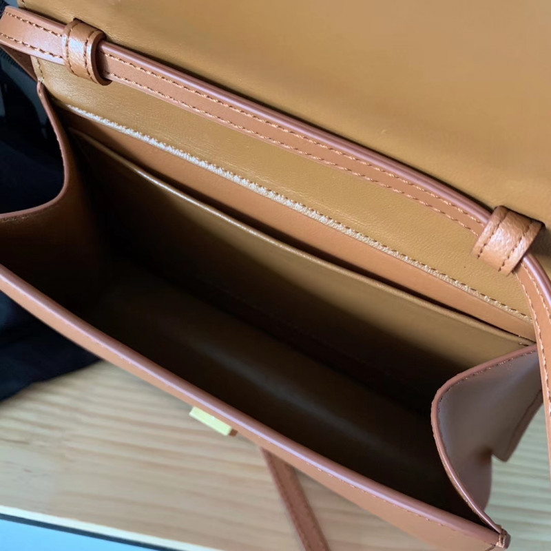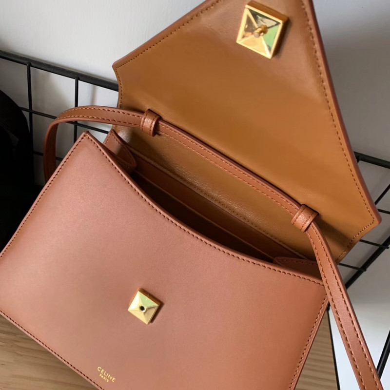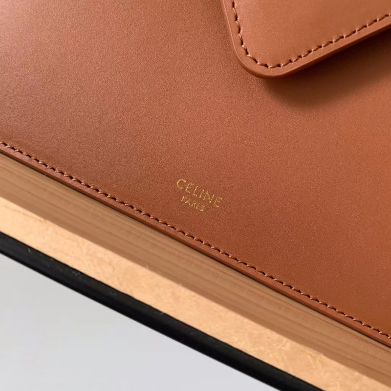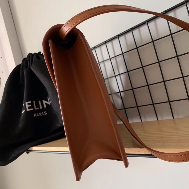 Celine smooth leather bag with removable strap and gold-printed logo on the front.