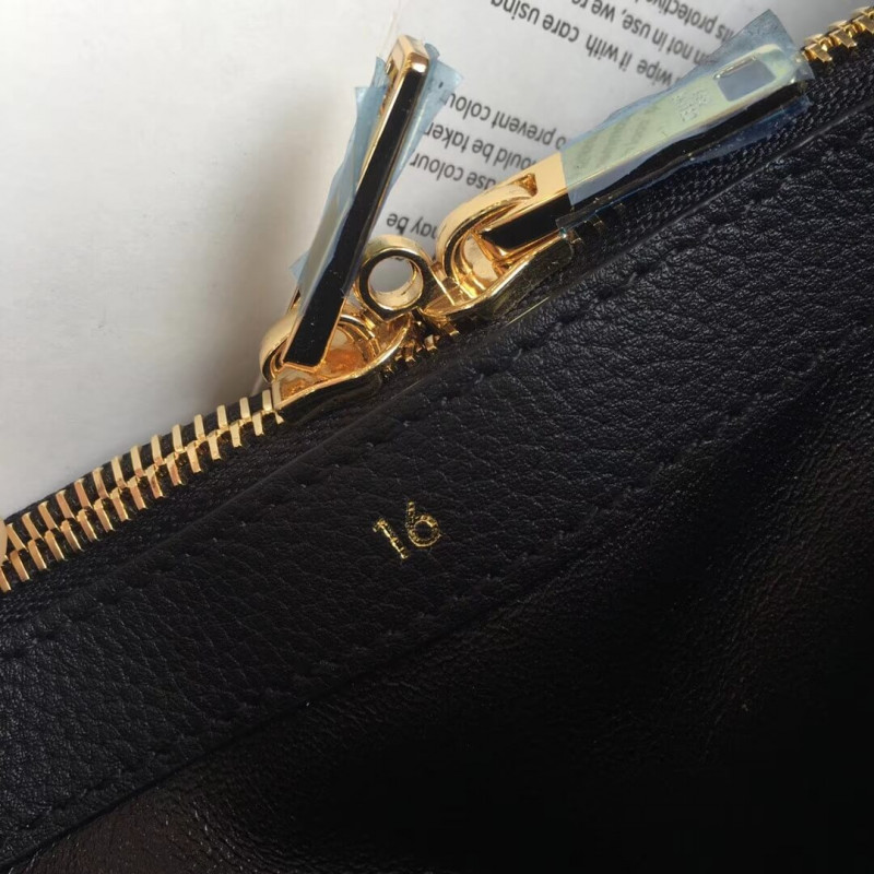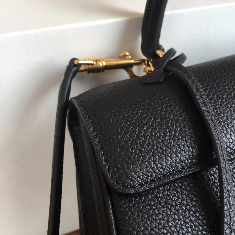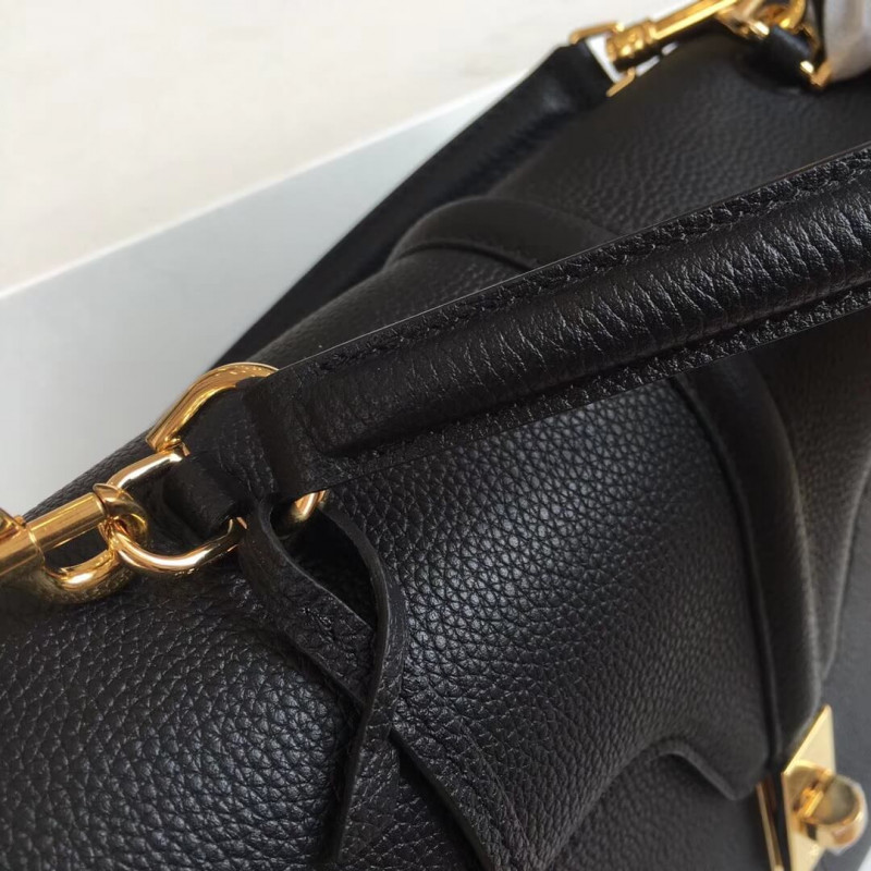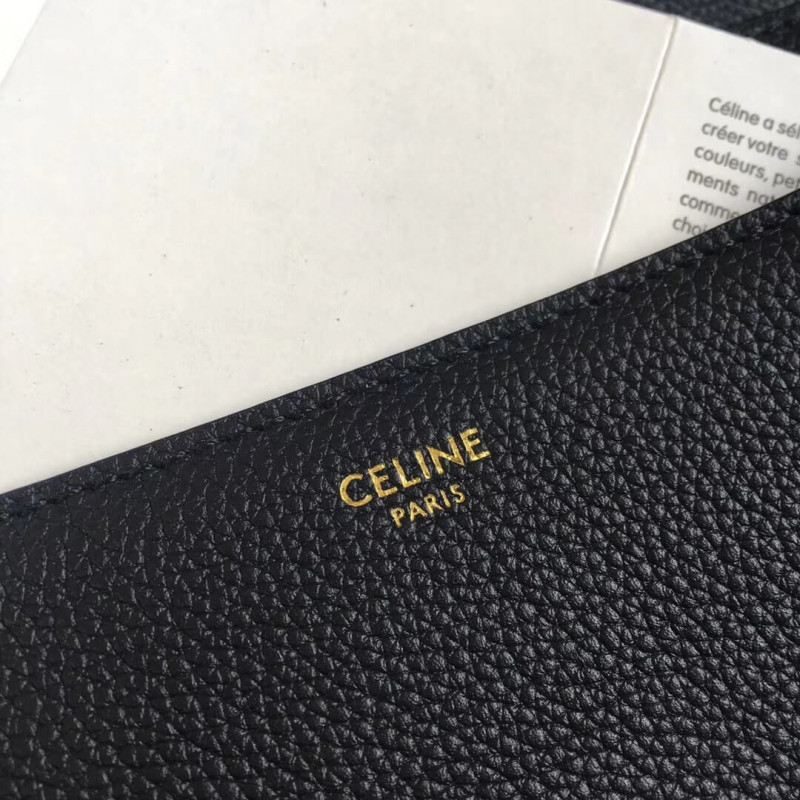 Medium 16 bag in grained calfskin with a leather handle, a removable shoulder strap, and an outer flat pocket under the flap. The bag has a twist lock closure and a celine padlock on a leather key cover.