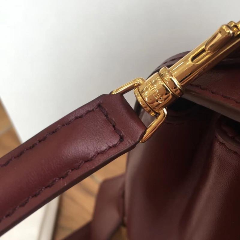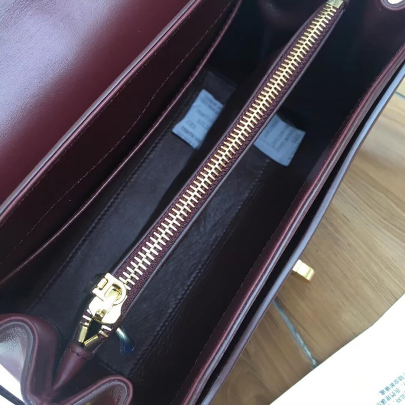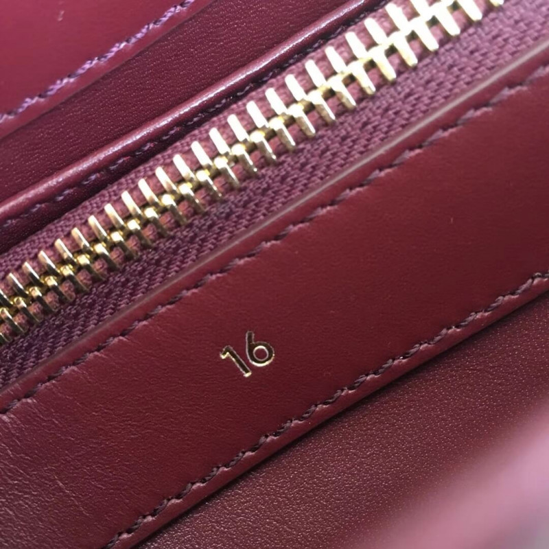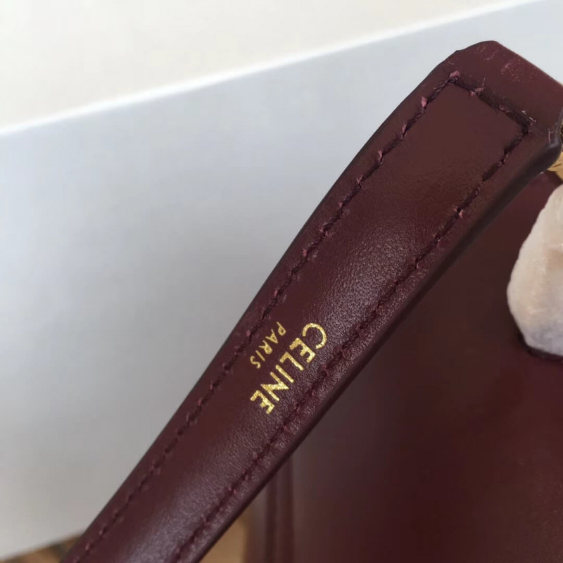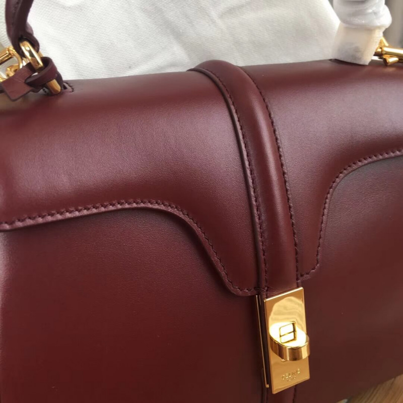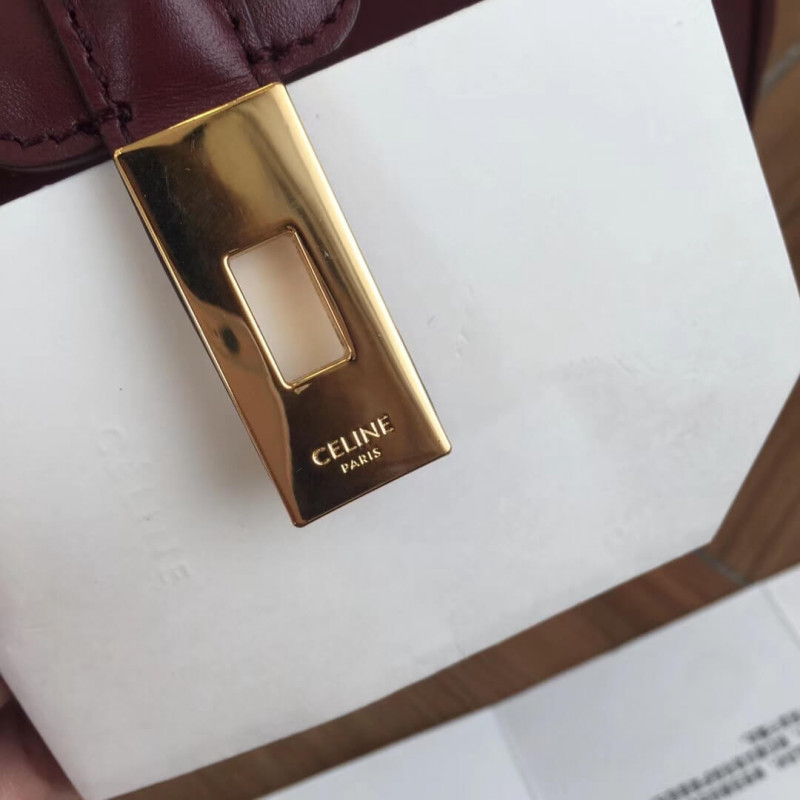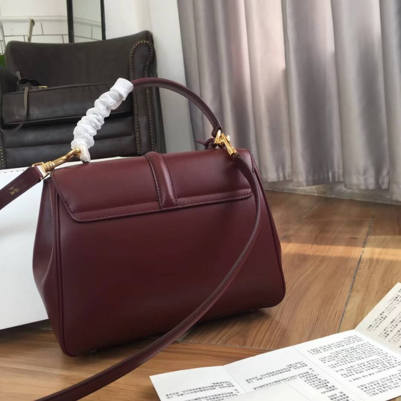 Small 16 bag in satinated calfskin with a leather handle, a removable shoulder strap, and an outer flat pocket under the flap. The bag has a twist lock closure and a celine padlock on a leather key cover.