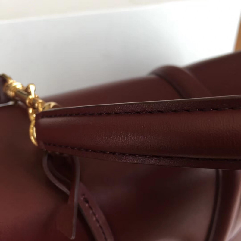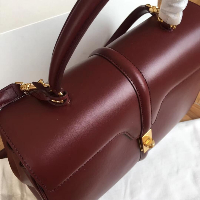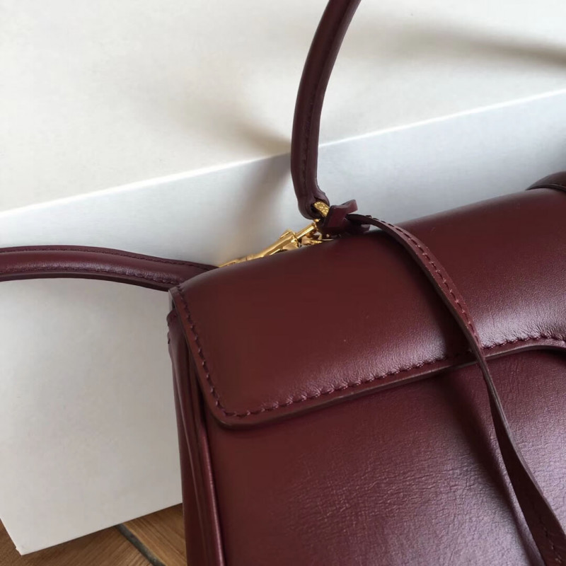 Medium 16 bag in satinated calfskin with a leather handle, a removable shoulder strap, and an outer flat pocket under the flap. The bag has a twist lock closure and a celine padlock on a leather key cover.