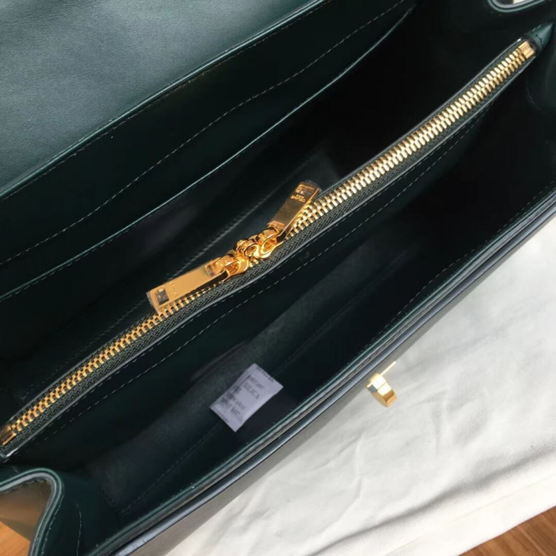 Medium 16 bag in satinated calfskin with a leather handle, a removable shoulder strap, and an outer flat pocket under the flap. The bag has a twist lock closure and a celine padlock on a leather key cover.